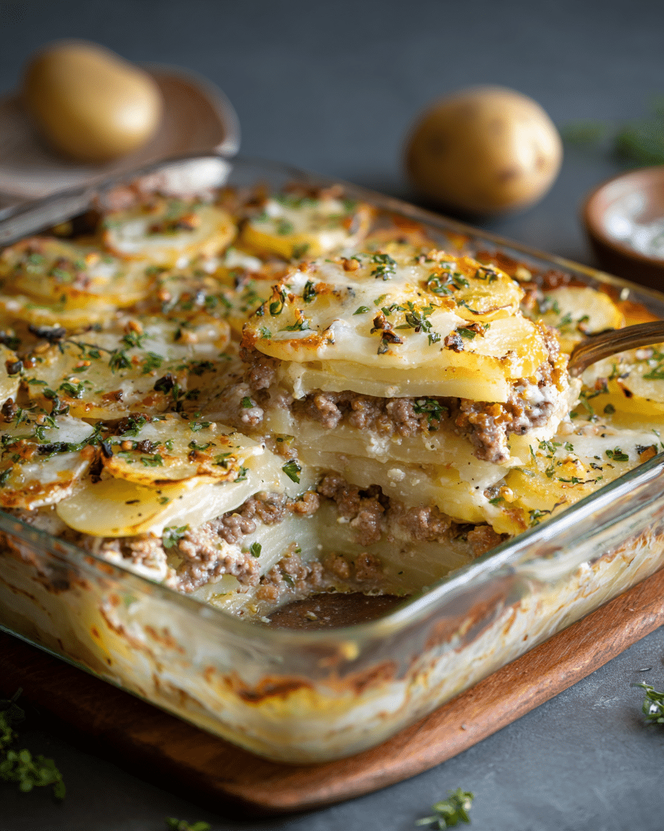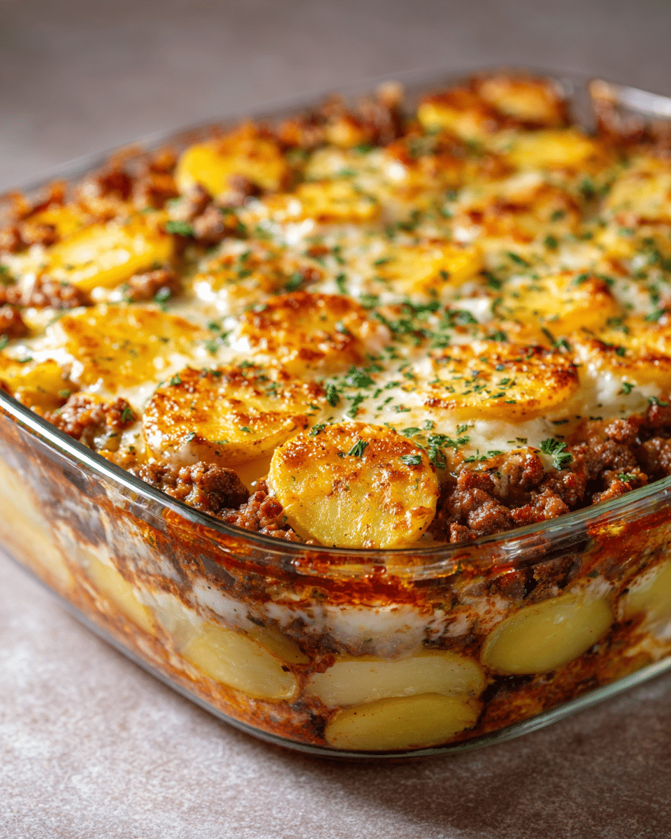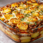 This Hamburger Potato Casserole is a cozy, layered dish of thin-sliced potatoes, seasoned beef, and gooey cheese—perfect for family dinners or make-ahead meals.