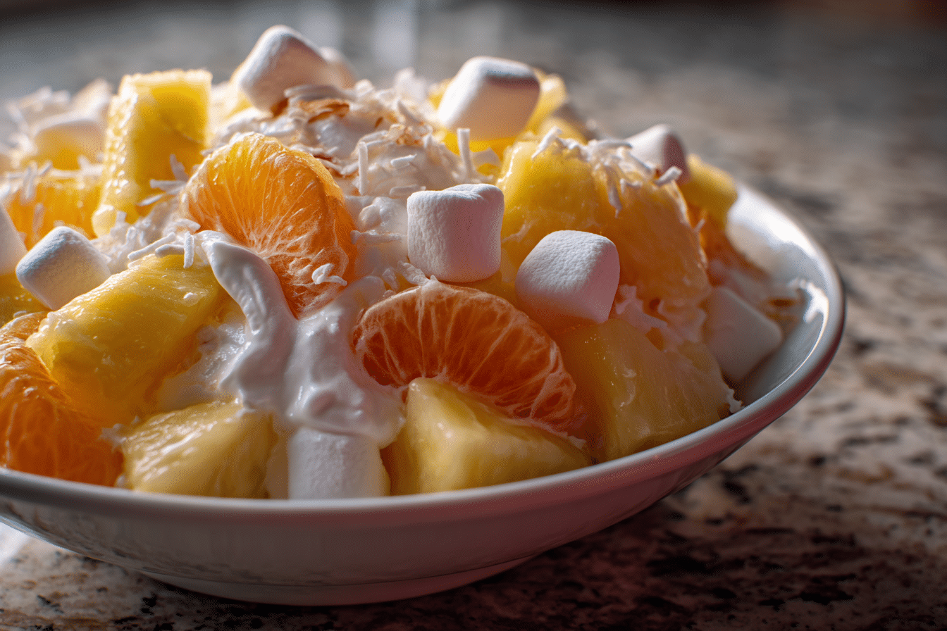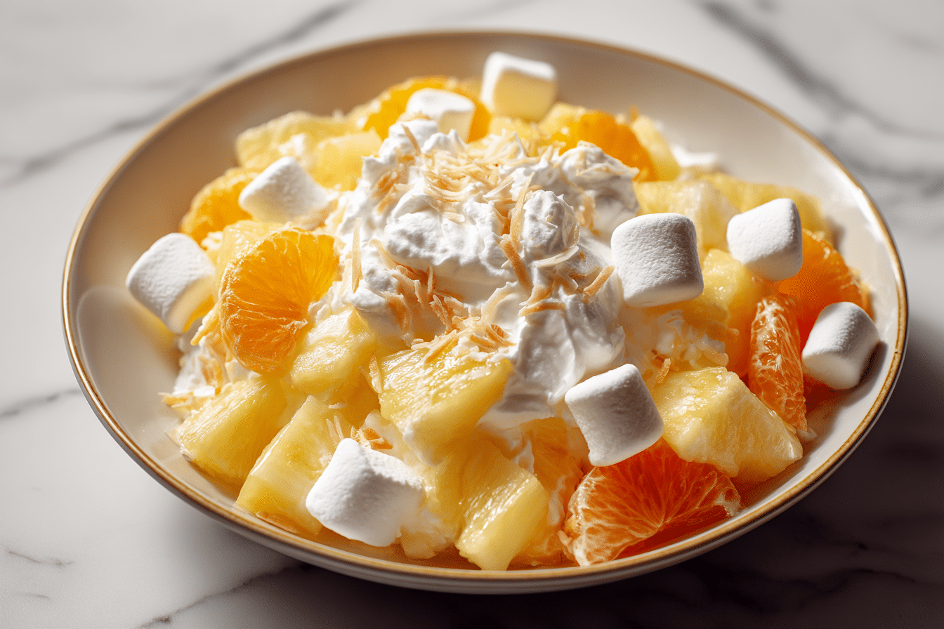Mini marshmallows add a soft, chewy element that absorbs some of the fruit juices, becoming even more tender as the salad chills. Shredded coconut introduces a subtle tropical depth and a gentle texture that complements the fruit without dominating it.