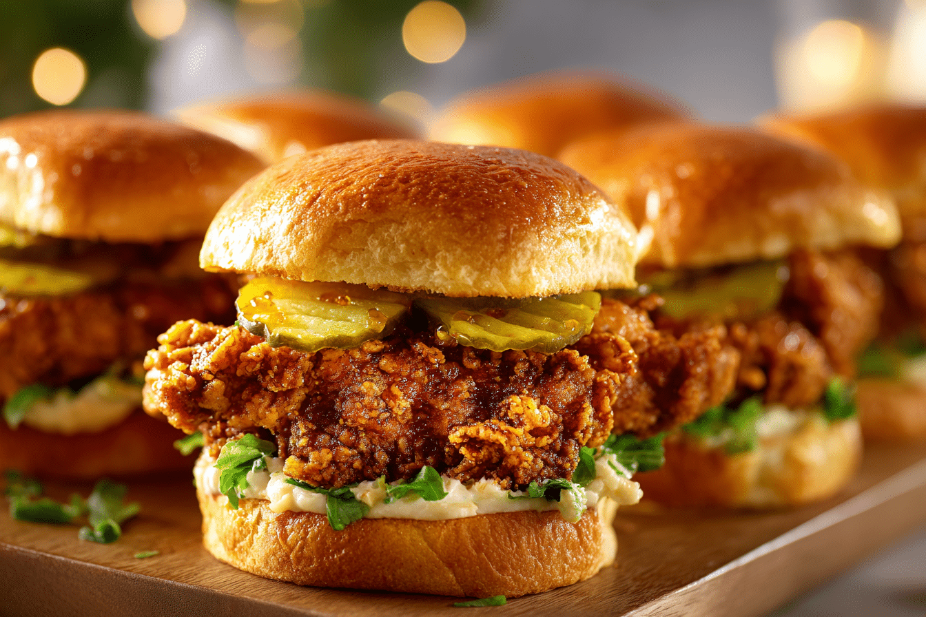 Crispy chicken thighs coated in a seasoned crust, topped with warm honey butter, and tucked into toasted brioche buns. This sandwich is a blend of sweet, savory, and crunchy goodness.