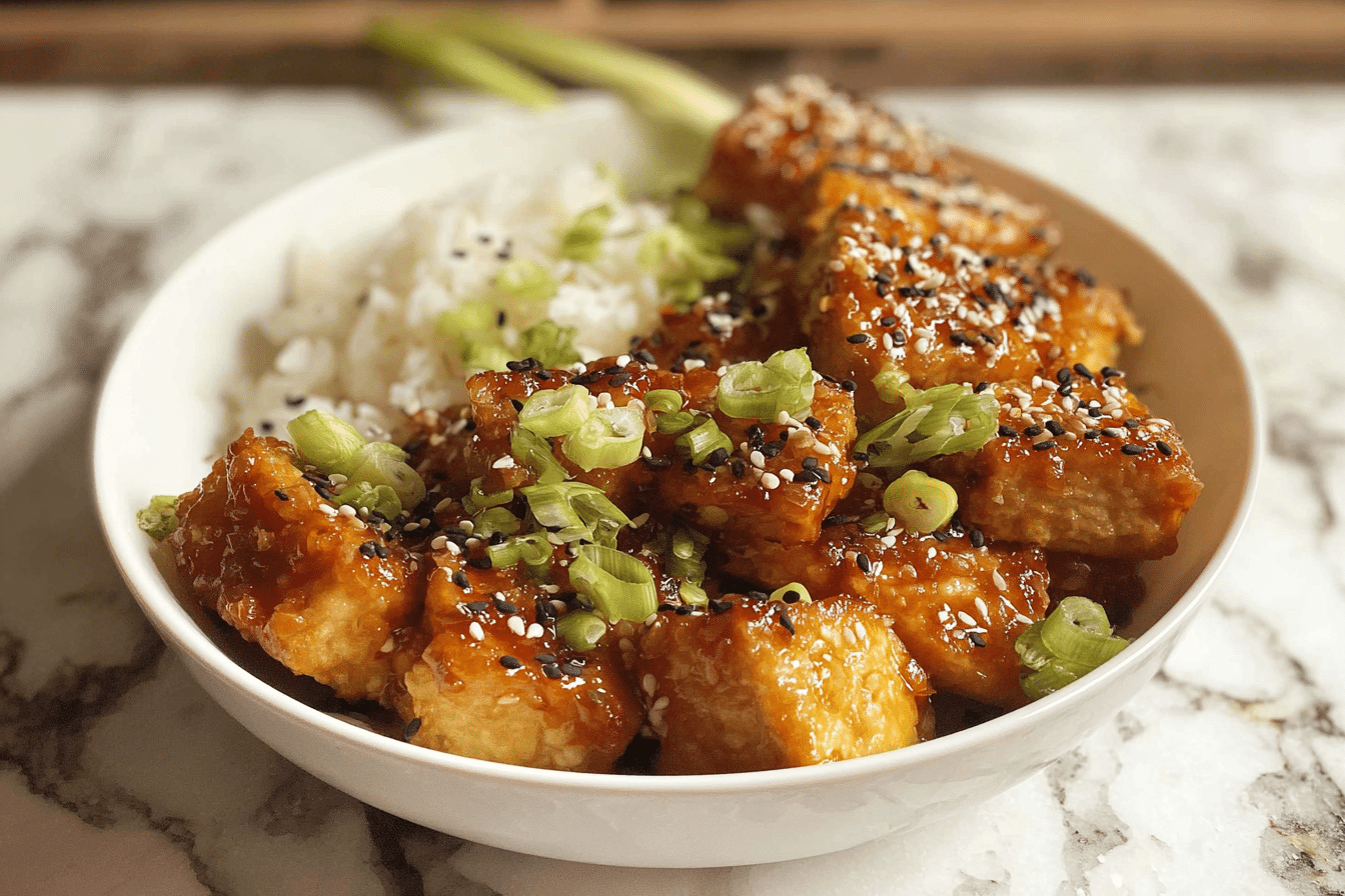 Crispy tofu coated in a sweet and savory honey garlic sauce, perfect for a quick and satisfying meal.