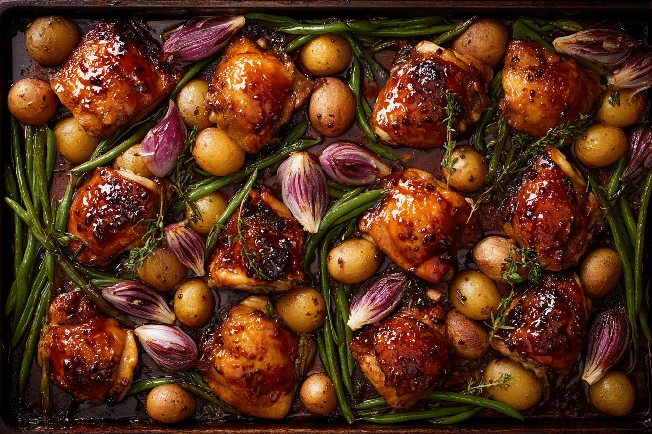 A flavorful one-tray meal featuring roasted chicken thighs glazed with hot honey and garlic, surrounded by tender vegetables caramelized to perfection. Simple, satisfying, and ideal for any night of the week.
