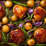 When you’re looking for a meal that’s simple to make yet bursting with flavor, this Hot Honey Garlic Chicken Thigh Tray Bake is a winning choice. Juicy chicken thighs roast to perfection in a fiery-sweet glaze, nestled among a medley of vegetables that soak up every bit of flavor from the pan. It’s a dish that brings together convenience, comfort, and bold taste—all in one tray.