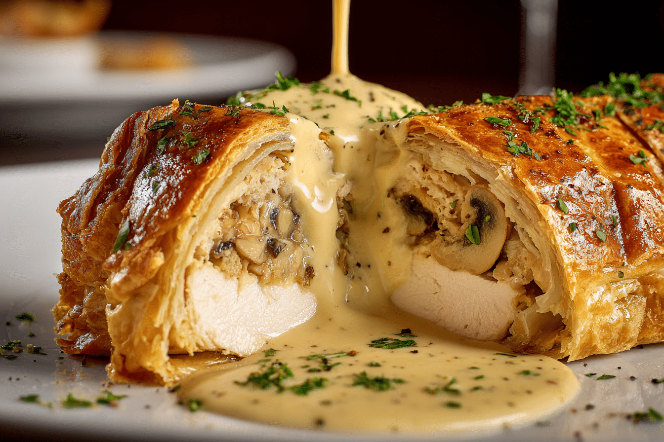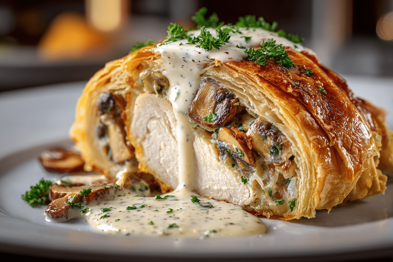 If you prefer a richer flavor, add a thin slice of prosciutto around the chicken before wrapping it in pastry. This adds a subtle salty layer that pairs well with the creamy sauce.
