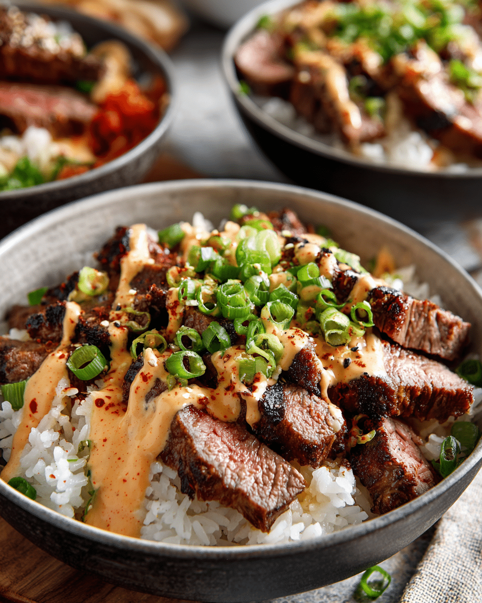 PrintKorean BBQ Steak Rice Bowls with Spicy Cream Sauce: Bold Flavors in Every Bite