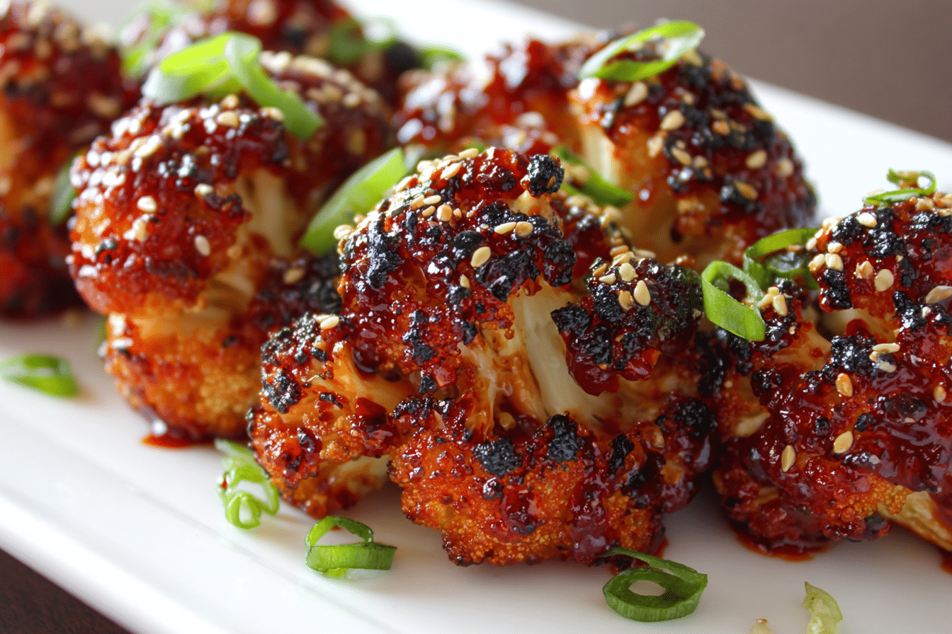 Remove from the oven and allow the cauliflower to rest briefly. Sprinkle with toasted sesame seeds and sliced green onions just before serving. Serve while hot for maximum contrast between crisp coating and sticky glaze.