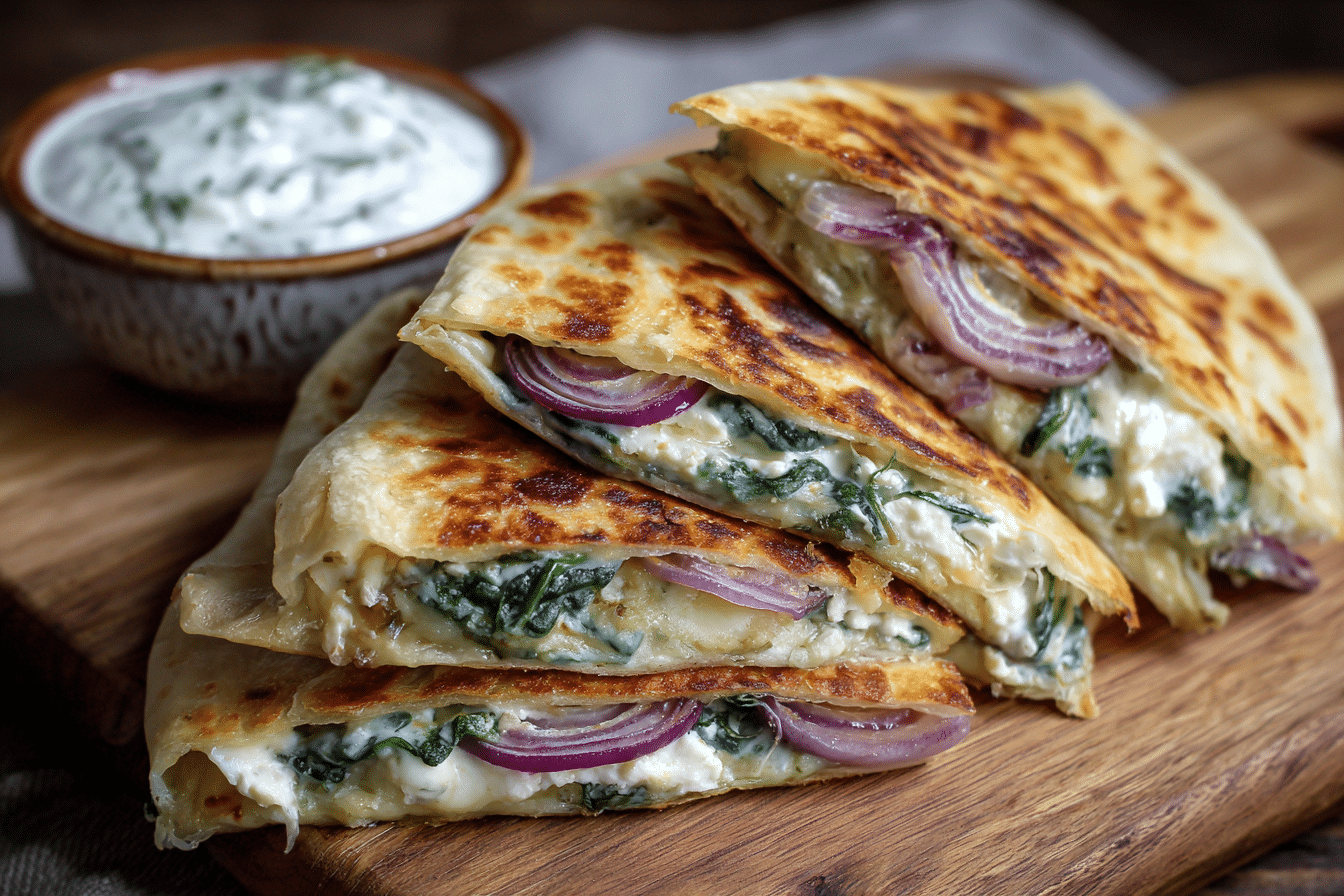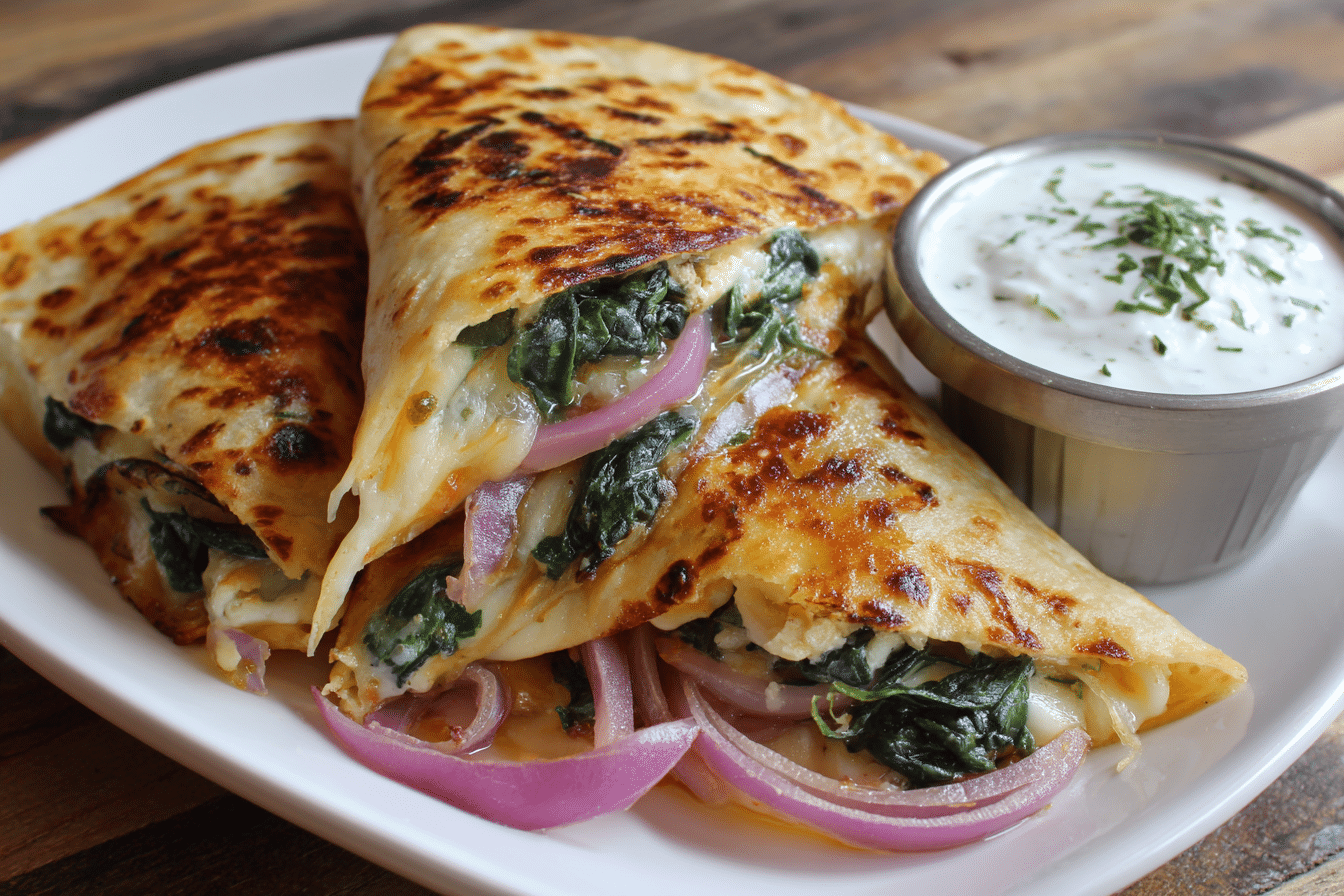 This dish blends the spirit of Greek-inspired fillings with the familiar format of a quesadilla. Spinach wilts into silky ribbons, feta adds a salty bite, mozzarella melts into smooth strands, and red onion softens into delicate sweetness. A quick skillet method creates a golden crust while keeping the interior lush and flavorful.