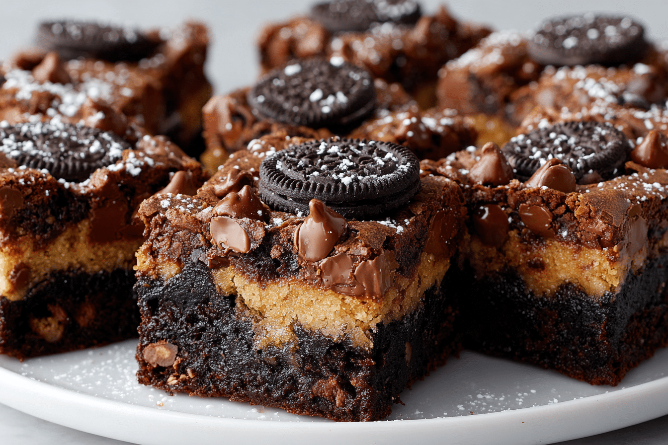 Layered brownies with a cookie base, Oreo center, and rich chocolate topping.