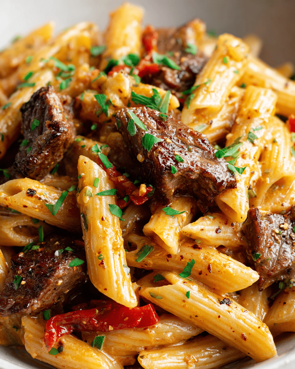 A bold and comforting one-skillet pasta dish with tender steak, spicy garlic butter, and melted Parmesan—all cooked together for easy cleanup and full flavor.