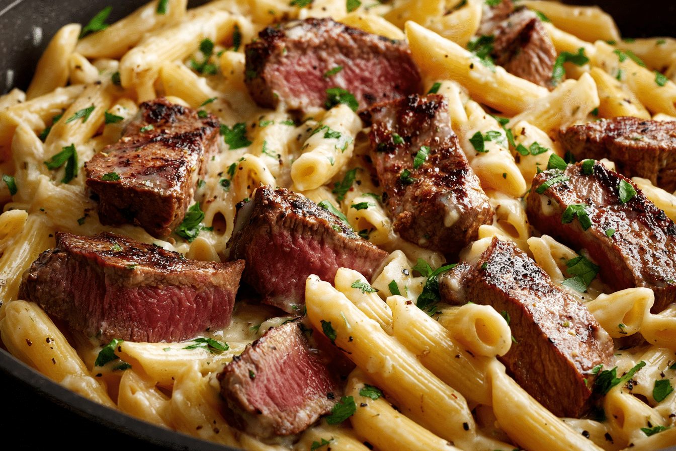 A3: Reheat gently on the stove with a splash of water, broth, or cream to loosen the sauce. Avoid microwaving too long — it can overcook the steak and pasta.