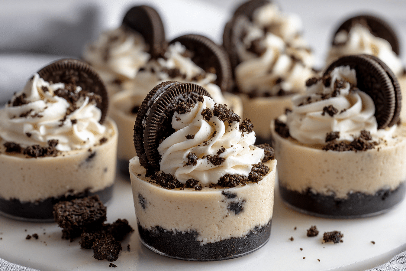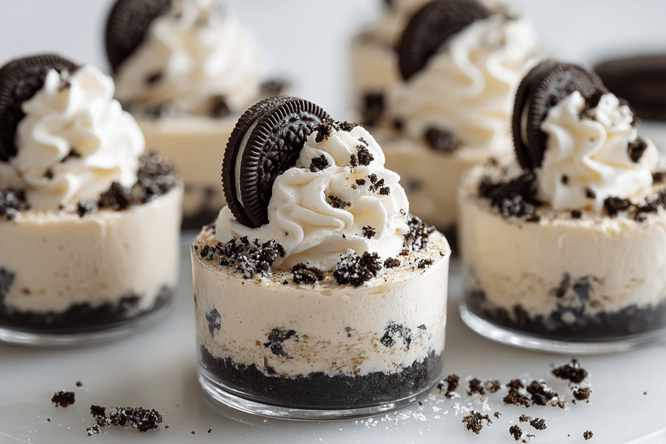 Creamy no-bake cheesecake layered with crushed Oreo cookies in individual dessert cups.