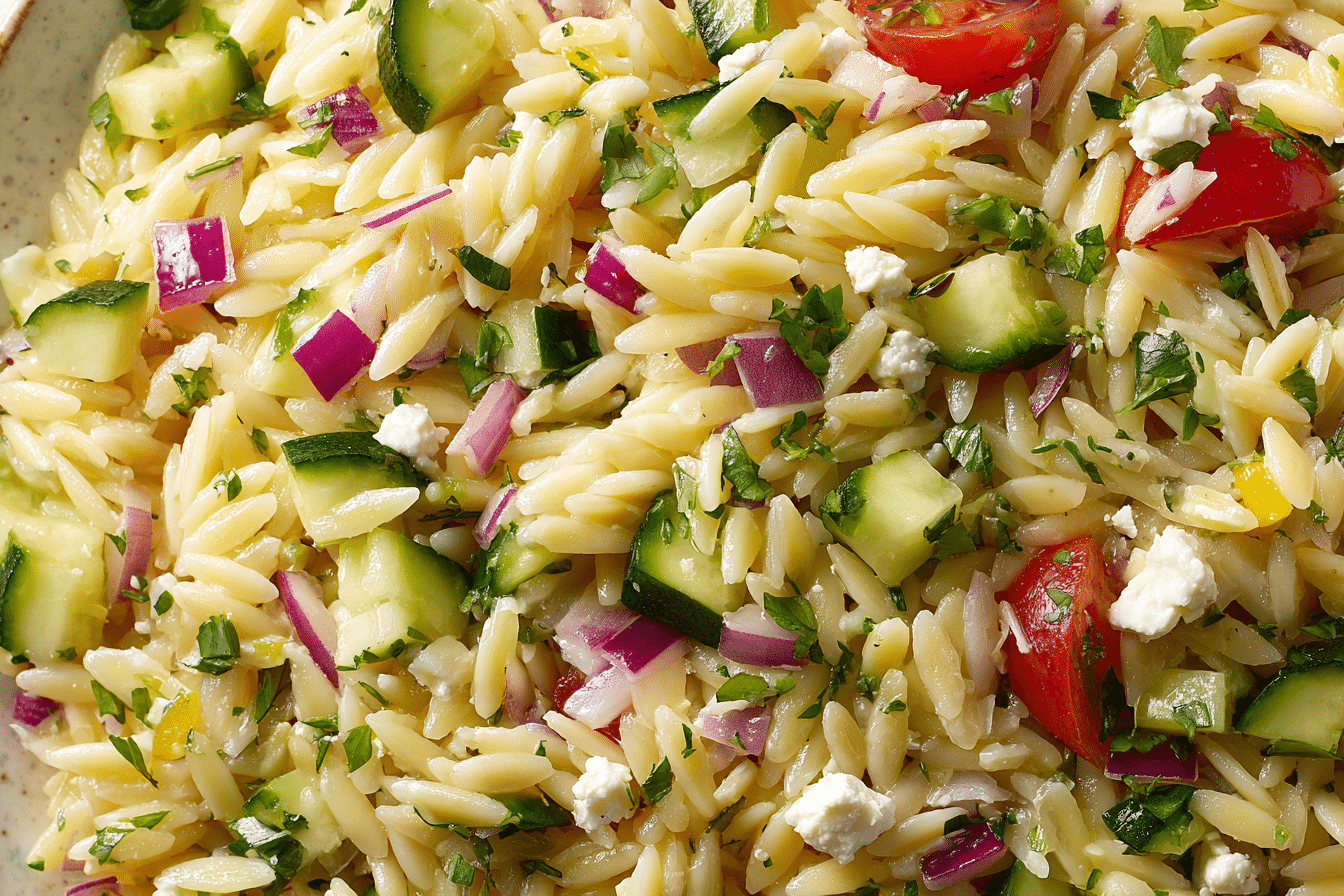 A fresh and light orzo pasta salad with crisp vegetables, feta cheese, and a bright lemon dressing, perfect for any occasion.