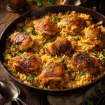 This Oven Baked Chicken and Rice dish combines tender, seasoned chicken with fluffy, flavorful rice — all baked in one pan for a simple, satisfying family dinner.