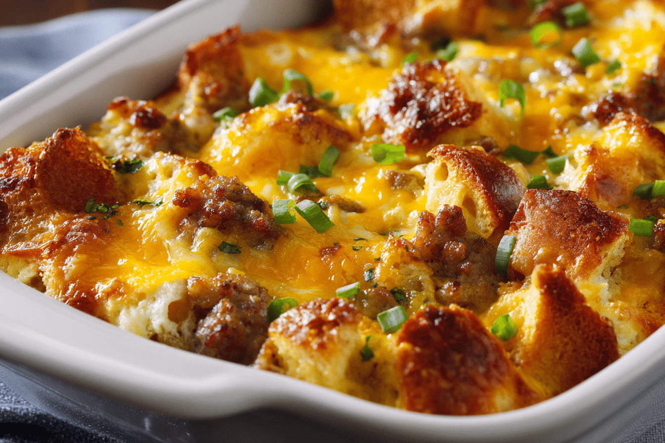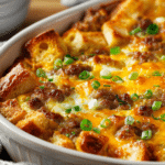 Overnight Breakfast Casserole is the kind of morning dish that turns a busy start into something calm and comforting. Prepared the night before and baked fresh in the morning, it fills the kitchen with the rich aroma of eggs, sausage, toasted bread, and melted cheese. Each bite is soft yet structured, savory yet balanced, with golden edges that add gentle texture.