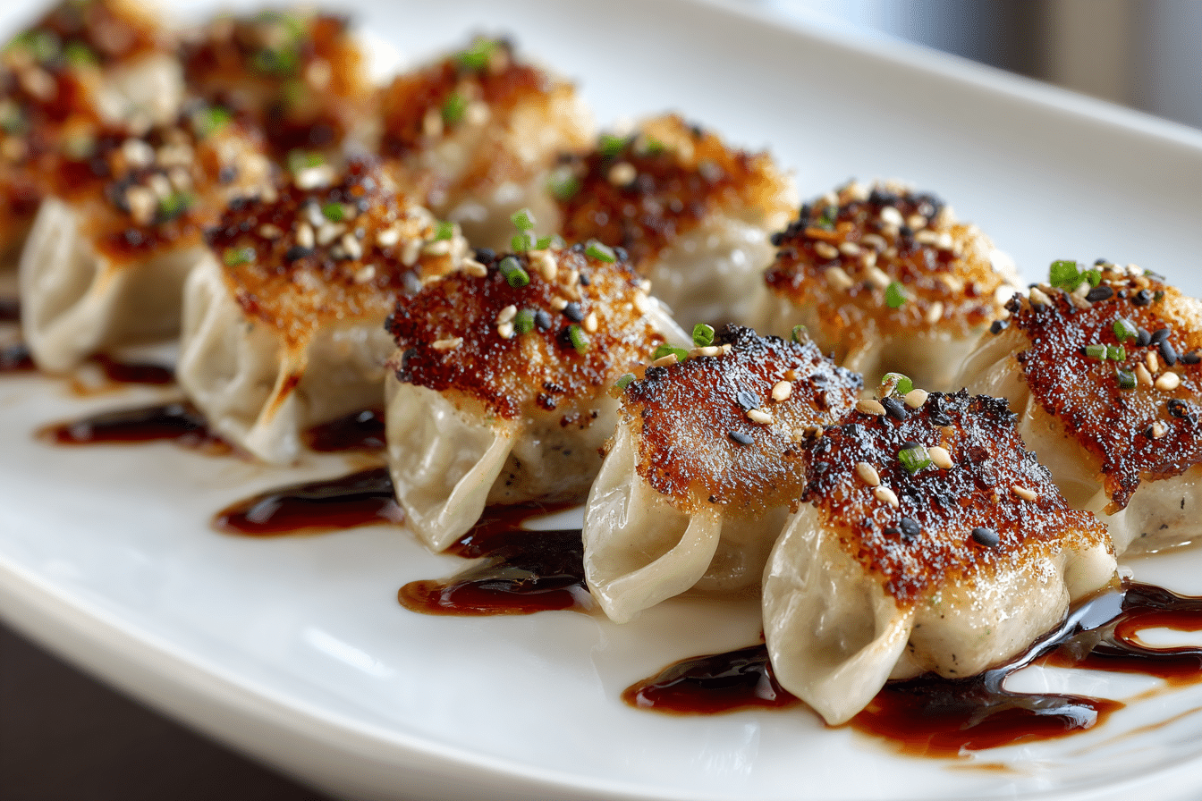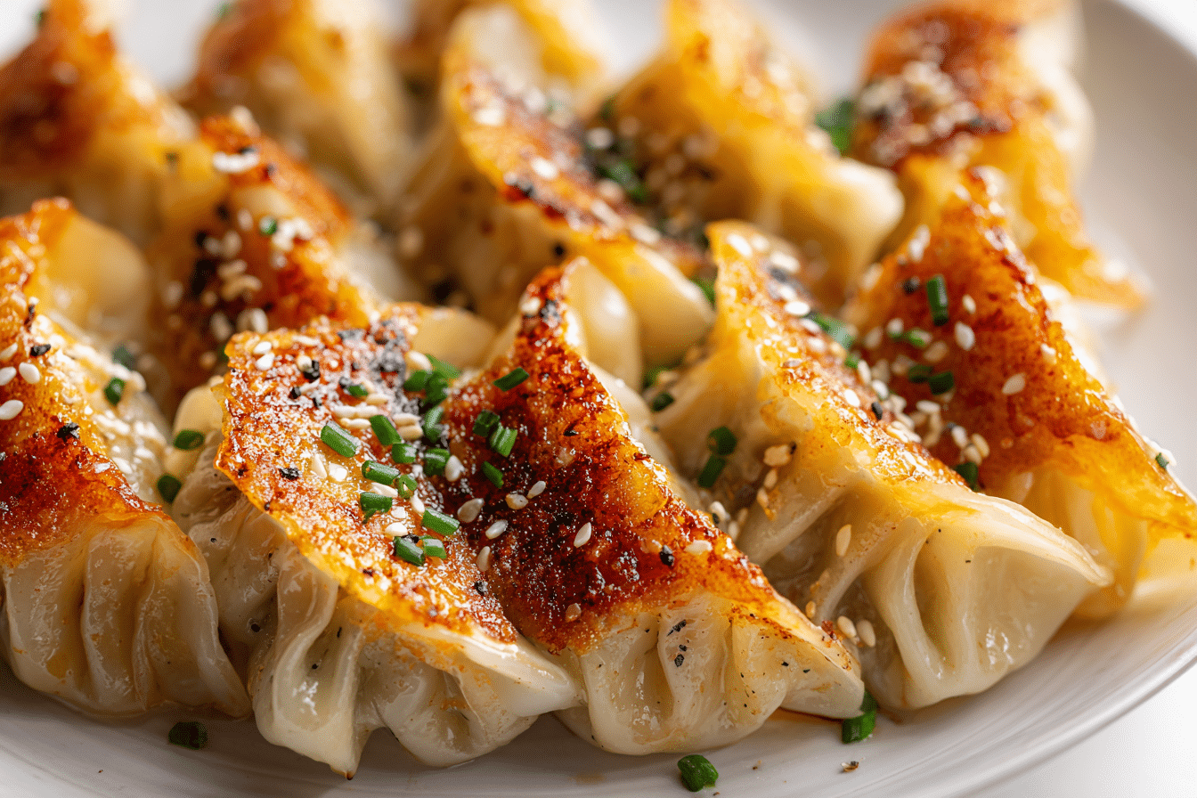 Crispy pan-fried chicken dumplings filled with seasoned ground chicken, fresh cabbage, and bold aromatics. Perfect for freezing or serving hot off the skillet.