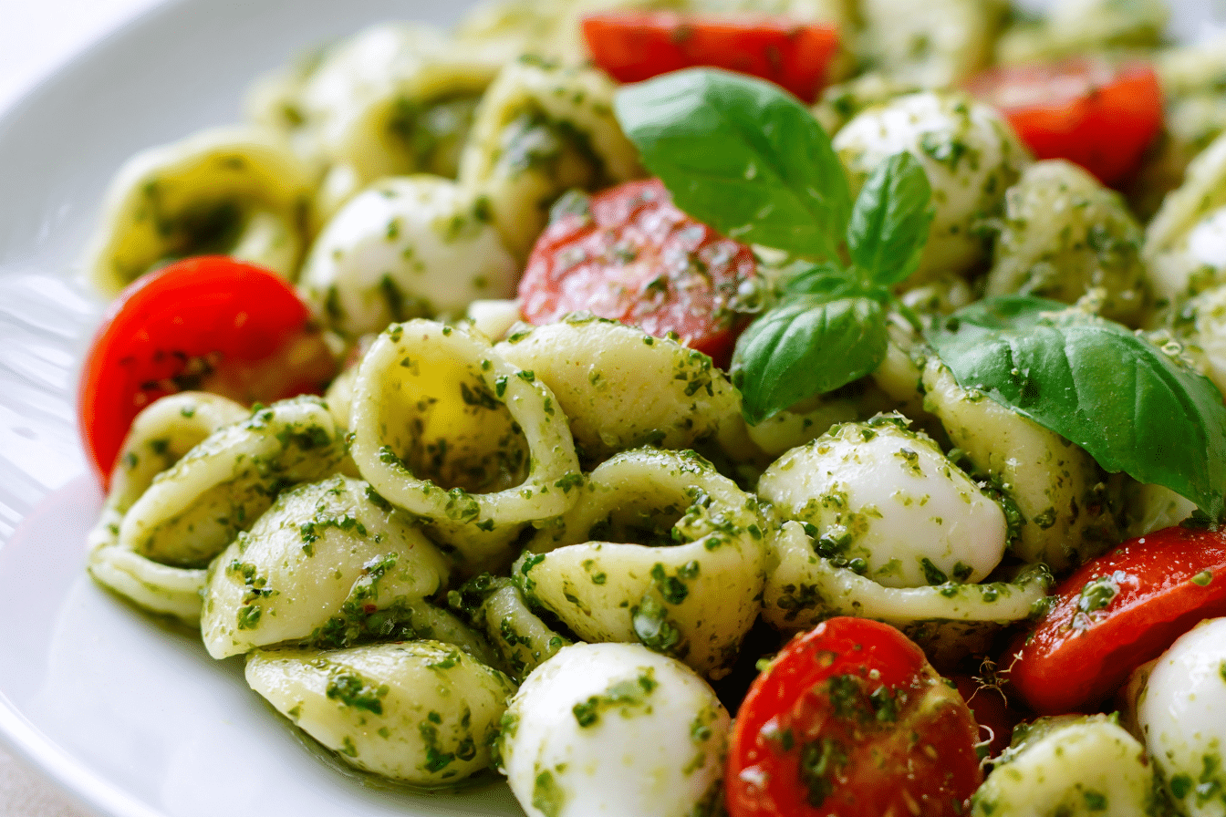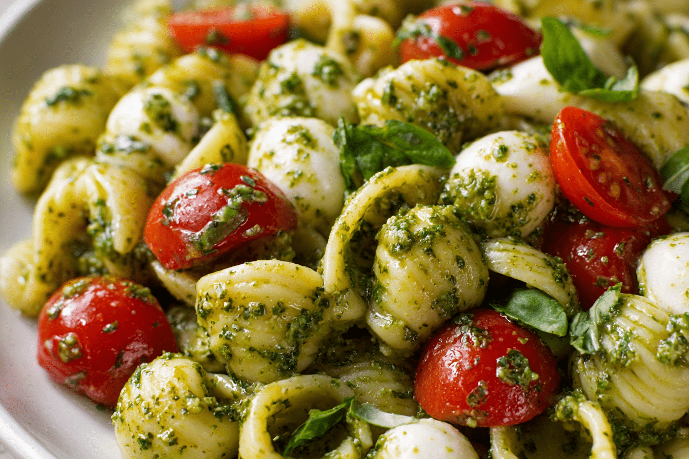 A fresh and flavorful pesto pasta salad with juicy tomatoes and creamy mozzarella, perfect for gatherings or quick meals.