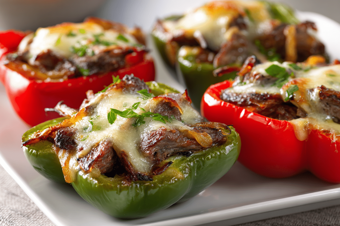 PrintPhilly Cheesesteak Stuffed Peppers combine tender bell peppers with thinly sliced beef, sautéed onions, and melted provolone for a hearty, low-carb twist on the classic sandwich.