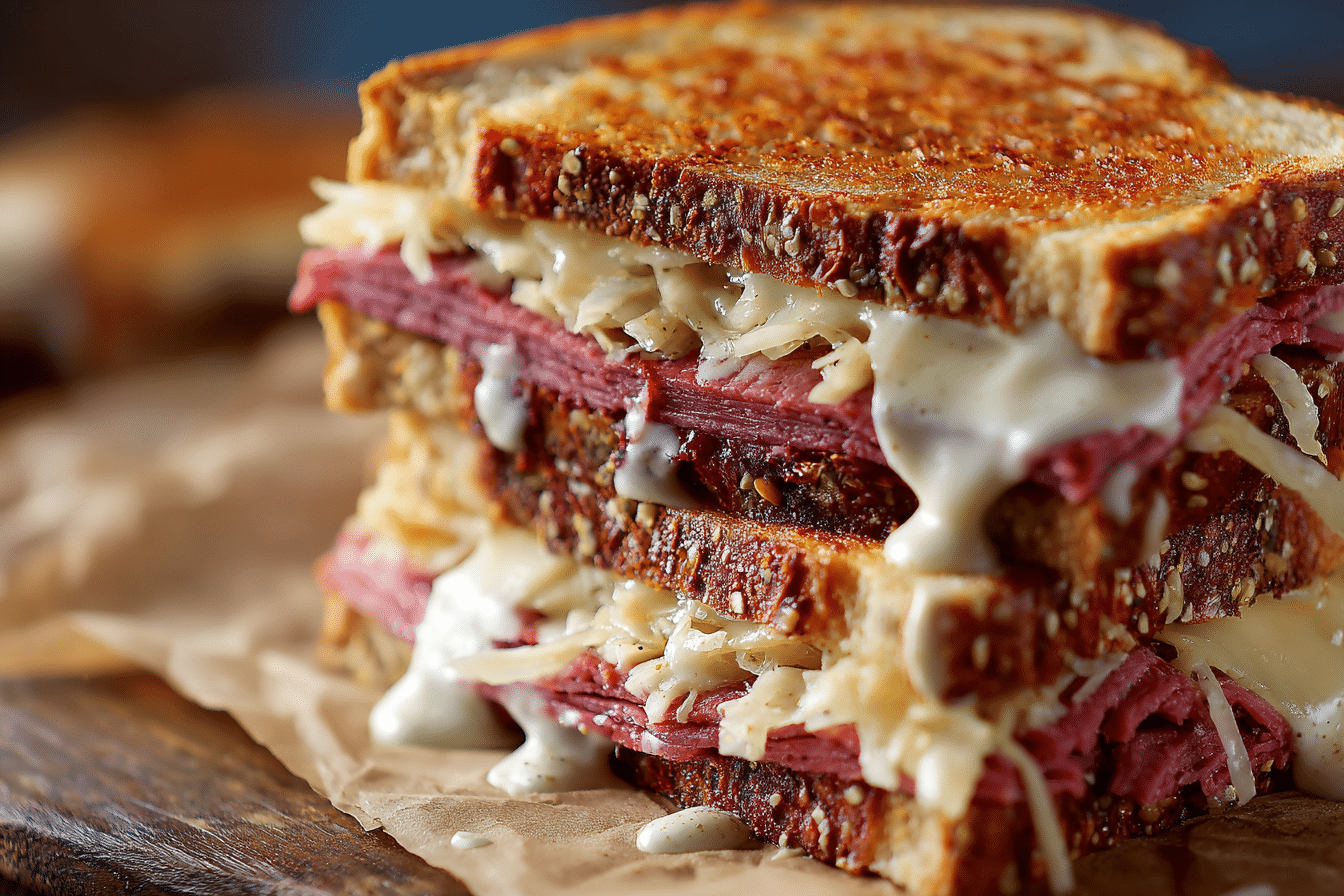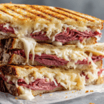 Few deli classics carry the same rich satisfaction as a Reuben Sandwich with Homemade Russian Dressing. With its stacked layers of tender corned beef, tangy sauerkraut, melted Swiss cheese, and buttery toasted rye bread, every bite delivers contrast and depth.