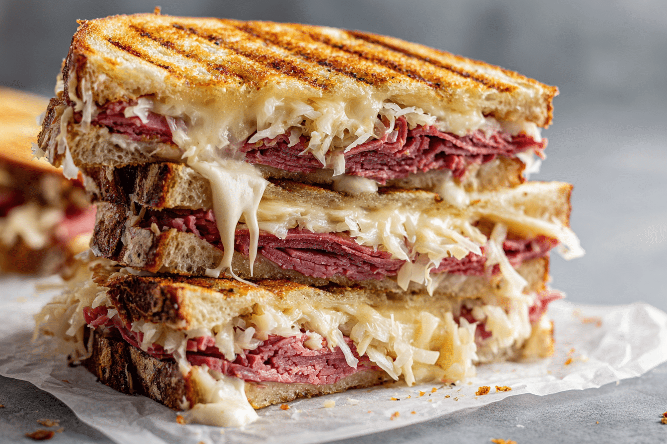 Thinly sliced deli-style corned beef with good marbling works best because it layers easily and warms quickly. Avoid thick, dry slices, which can make the sandwich difficult to bite through. If using leftover corned beef brisket, slice it thinly across the grain to keep the texture tender and easy to stack.