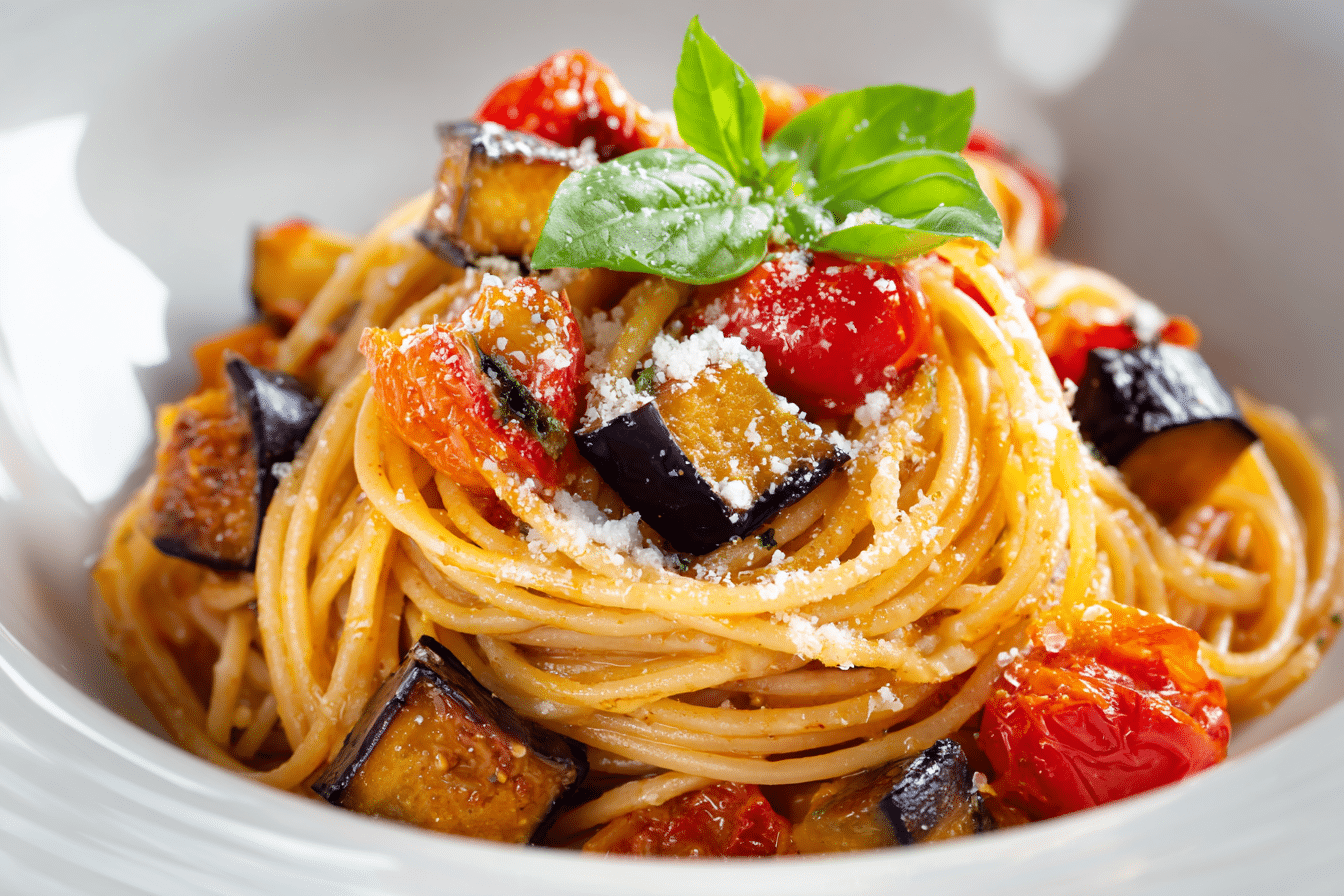 Pasta acts as the structural component that ties everything together. Short shapes such as penne, rigatoni, or fusilli hold the sauce well and capture pieces of roasted eggplant within each bite.
