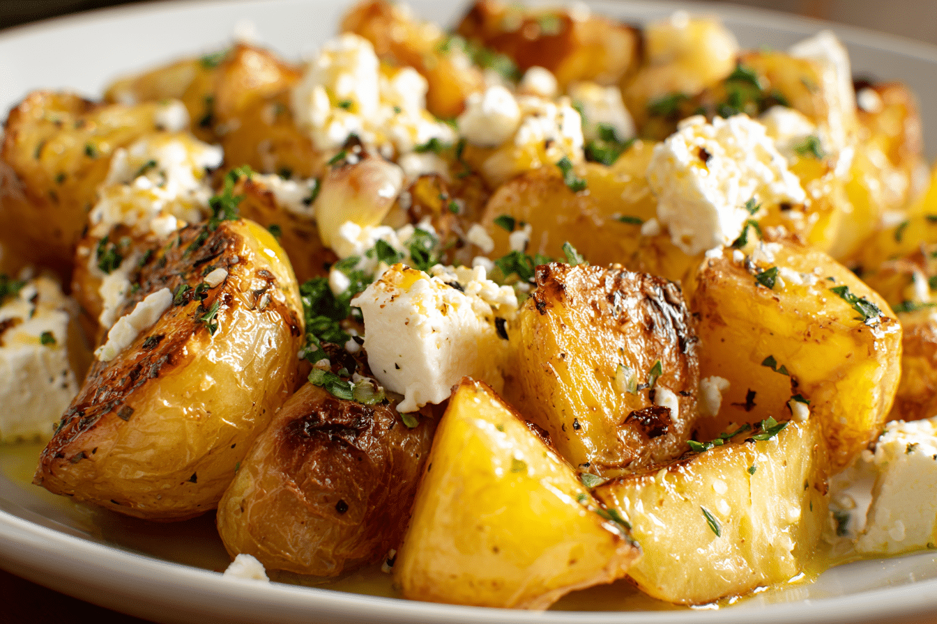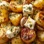 Roasted Potatoes with Baked Feta and Garlic is a comforting, flavor-packed dish that combines crispy golden potatoes with creamy, oven-softened feta and rich roasted garlic. As the feta bakes, it becomes warm and slightly spreadable, blending beautifully with the caramelized garlic and crisp potatoes.