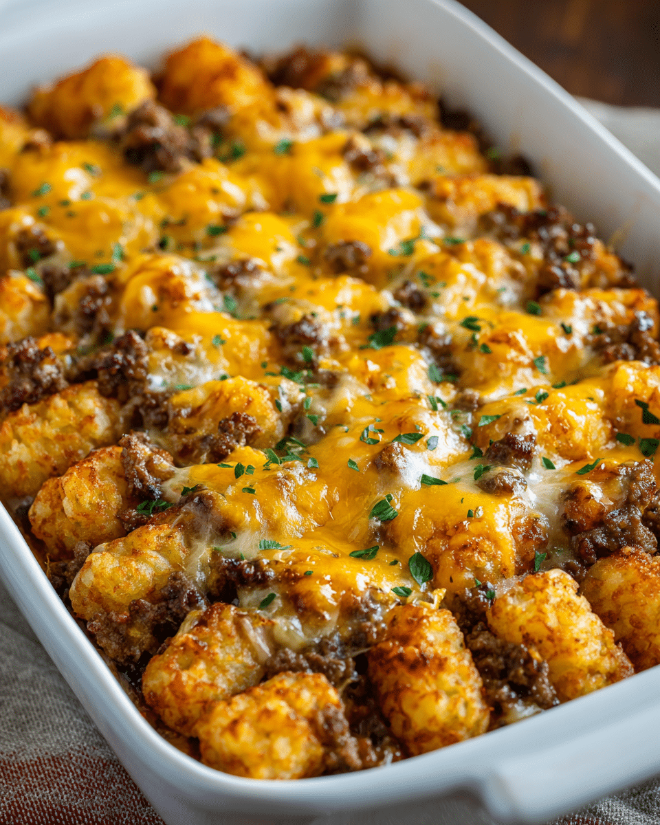Bake uncovered for 35–40 minutes, or until the tots are golden brown and crispy. For extra crispiness, broil the casserole for the final 2–3 minutes—but watch closely to prevent burning.