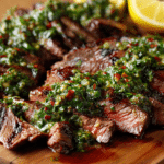 This version focuses on a balanced marinade that tenderizes the steak while building layers of flavor. Once grilled or seared, the steak slices easily across the grain and carries a juicy texture that works beautifully with chimichurri spooned across the top.