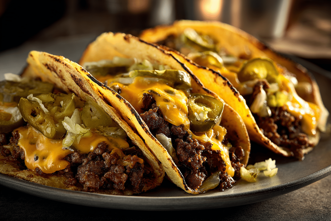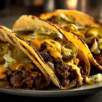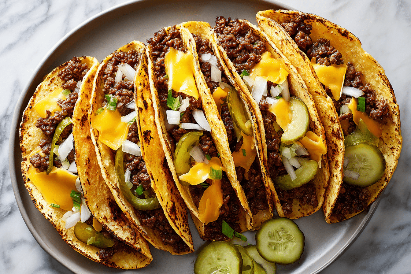 Smashed Cheeseburger Tacos combine the rich, savory flavors of a classic cheeseburger with the crisp, handheld ease of a taco. Thin tortillas are layered with seasoned ground beef, pressed directly onto the surface, and cooked until perfectly browned, then topped with melted cheese and fresh toppings.