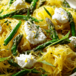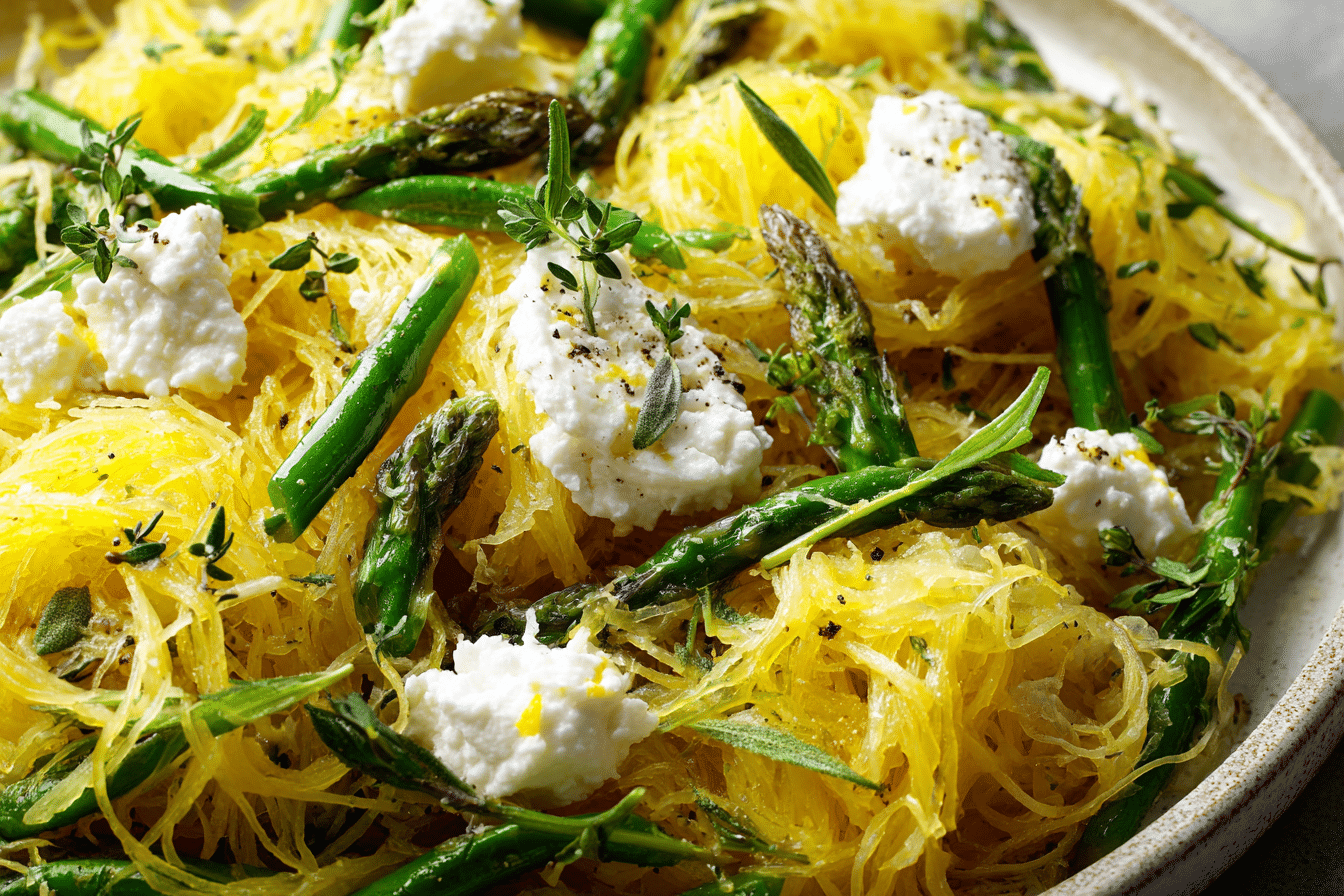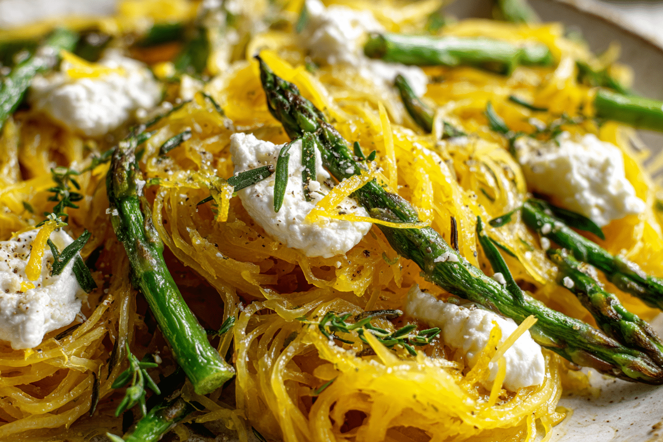 Spaghetti Squash with Asparagus, Ricotta, Lemon, and Thyme is a light yet satisfying vegetarian dish featuring roasted squash strands tossed with tender asparagus, creamy ricotta, fresh lemon zest, and fragrant thyme.