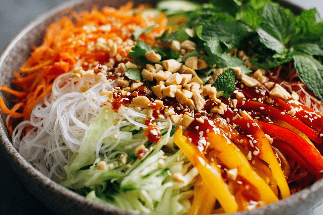 This salad offers a balanced combination of carbohydrates, lean protein, and healthy fats. Rice noodles provide energy, while cabbage and carrots contribute fiber and antioxidants.