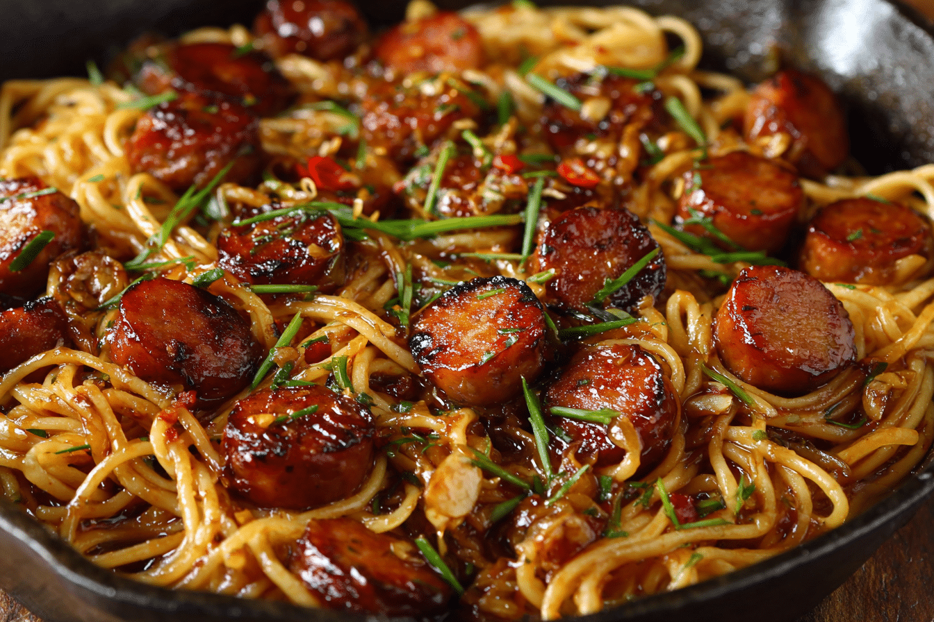 A one-pan pasta skillet with smoked sausage, tender pasta, and a sticky honey garlic sauce.