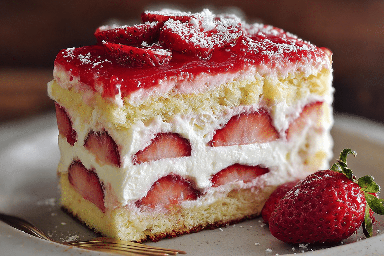 For presentation, garnish with extra sliced strawberries or a light swirl of whipped cream. Its soft layers make it easy to portion into squares or spoon into bowls.