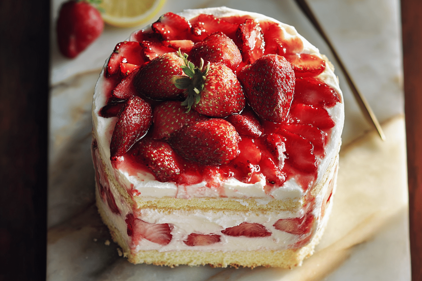 The strawberry layer brings freshness and natural flavor. Fresh strawberries are usually combined with a simple glaze or gelatin mixture to help them set. This layer adds color, brightness, and a soft texture that complements the creamy filling.