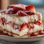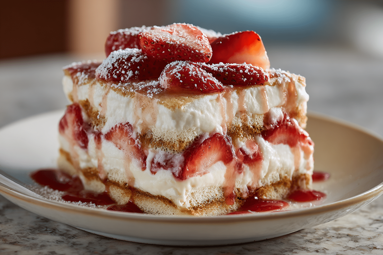 Strawberry Tiramisu is a fresh twist on the classic Italian dessert, replacing coffee and cocoa with bright strawberries and a lightly sweet cream filling. The result is a layered dessert that feels soft, creamy, and refreshing with every bite.