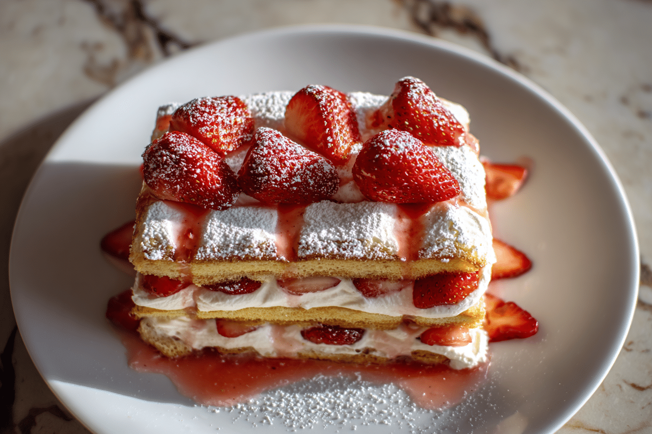 The strawberry syrup replaces the traditional coffee soak. Made from fresh strawberries, sugar, and a bit of water, it adds both moisture and flavor. This syrup gives the dessert its signature fruit-forward taste and a subtle pink hue.