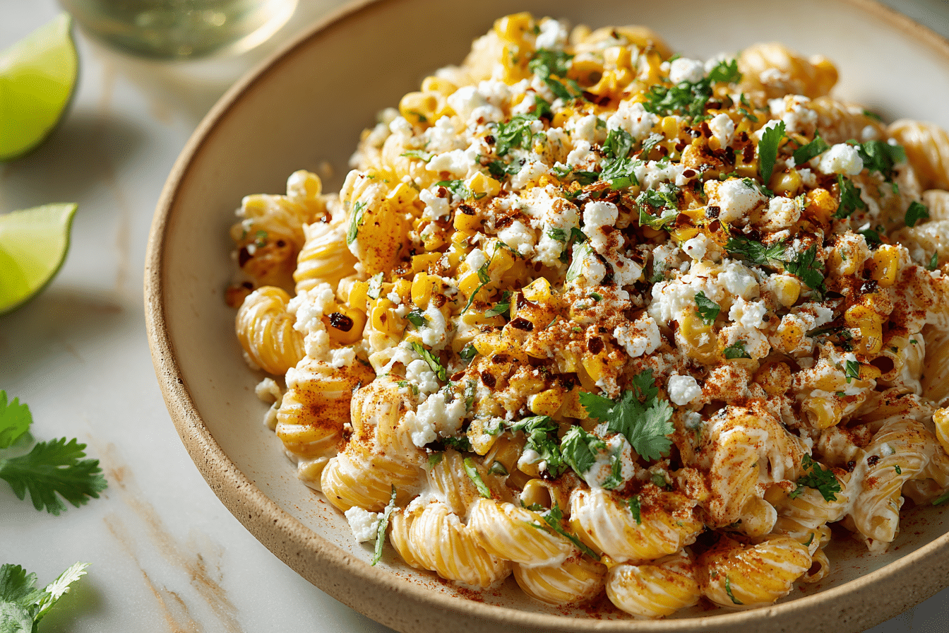 A creamy and tangy pasta salad inspired by Mexican street corn, featuring charred corn, lime, cheese, and a hint of spice.