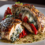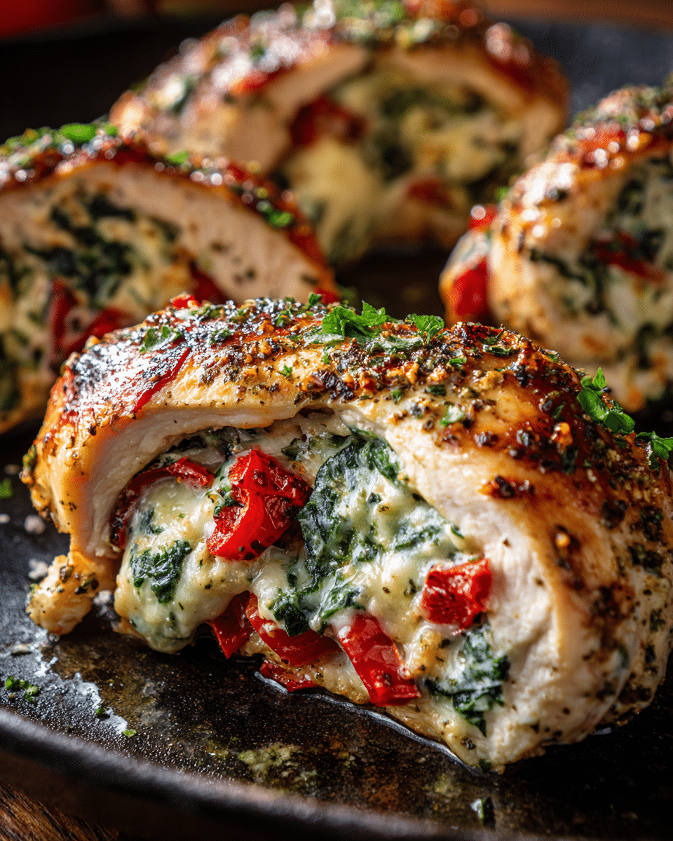 Juicy chicken breasts stuffed with a flavorful mixture of sautéed spinach, sweet red peppers, and gooey mozzarella cheese — baked to perfection for a hearty, satisfying meal.