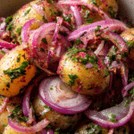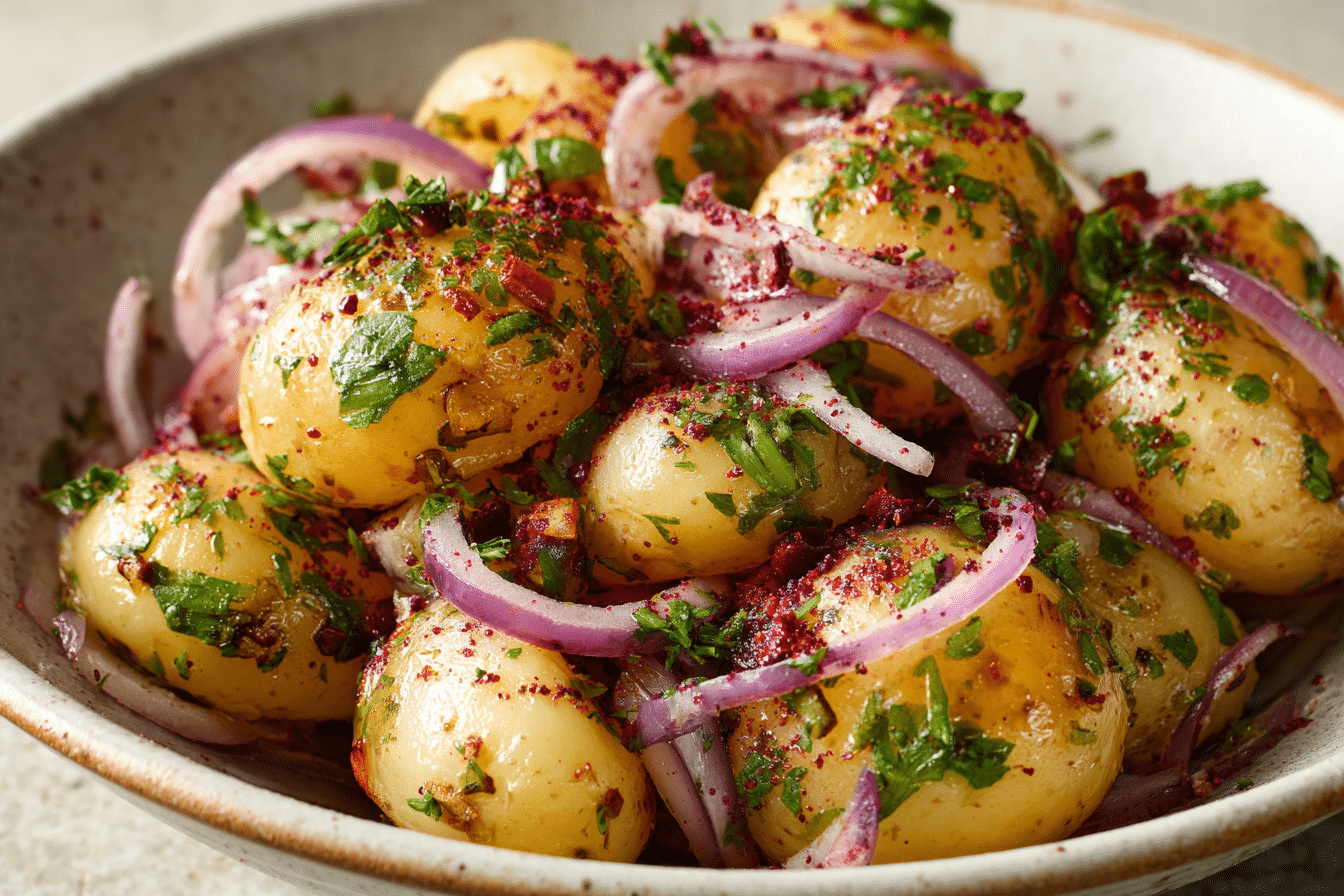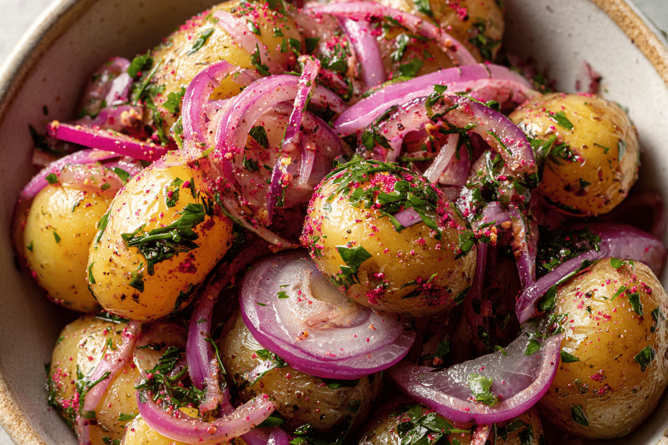 Sumac Potato Salad brings a fresh, citrusy twist to a familiar favorite. Instead of a heavy mayonnaise dressing, this version leans on olive oil, lemon juice, and the deep ruby tang of ground sumac. The result is vibrant, slightly tart, and layered with herbal warmth.