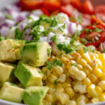 Fresh corn plays the central role in this salad. When combined with ripe avocado and colorful vegetables, the result is a bowl filled with texture and natural flavor. The ingredients remain simple, yet together they create a dish that feels lively and satisfying.