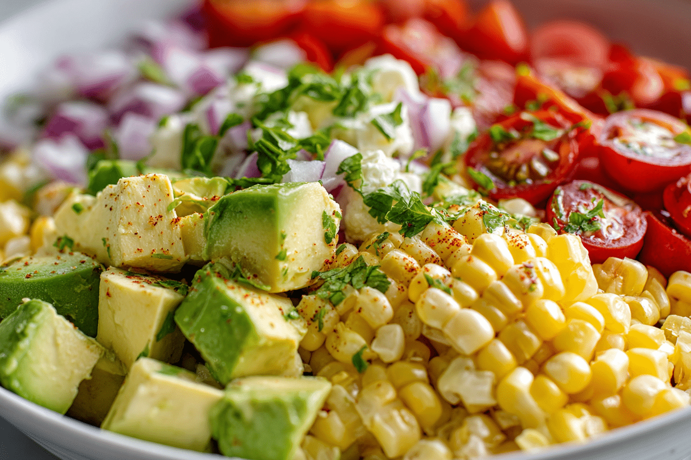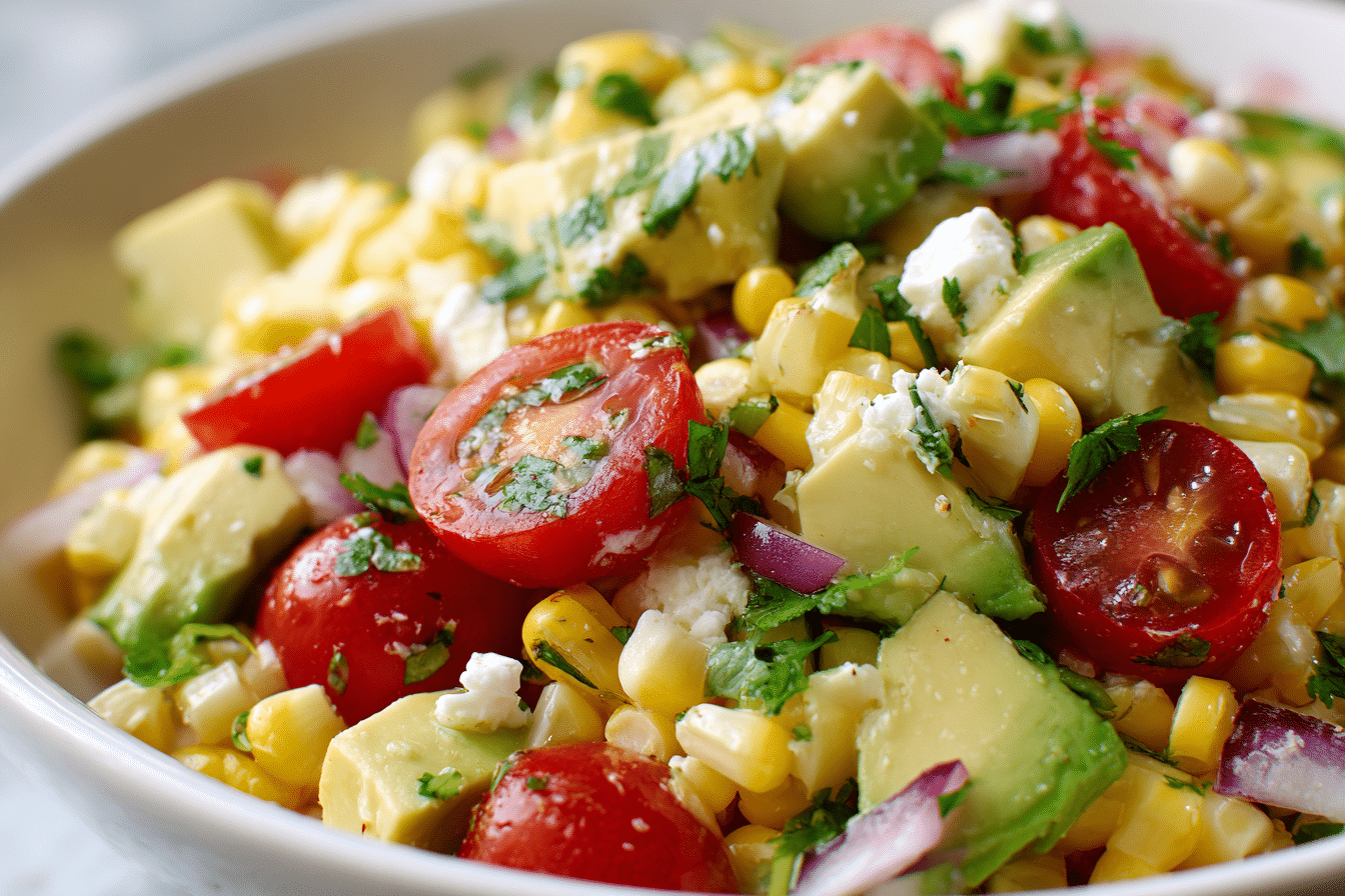A refreshing salad featuring sweet corn, creamy avocado, tomatoes, and a bright lime dressing.