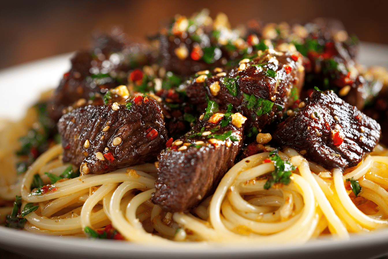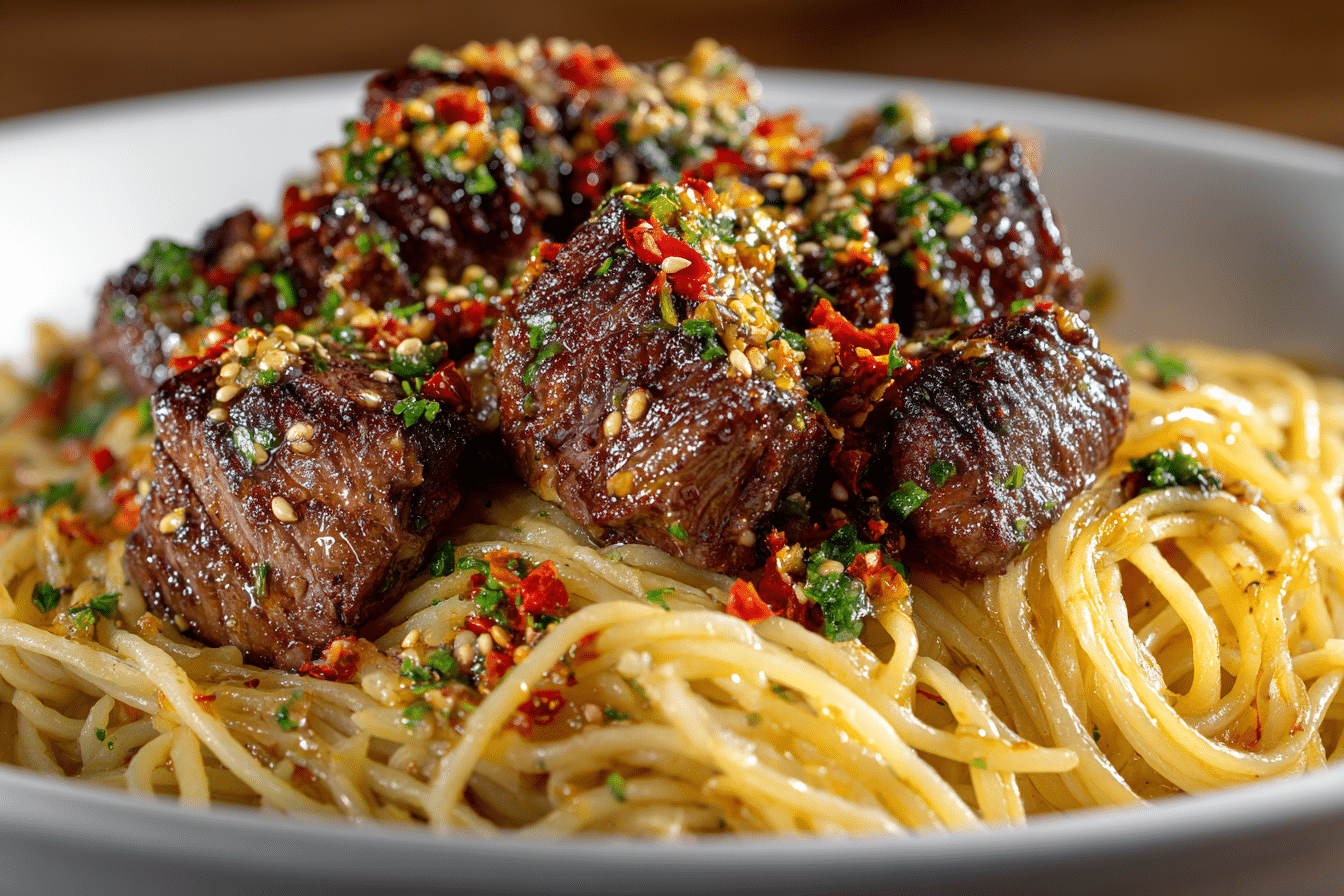 A bold and flavorful pasta dish with tender seared steak, sweet chili garlic glaze, and perfectly coated noodles—ideal for weeknights or special dinners.