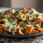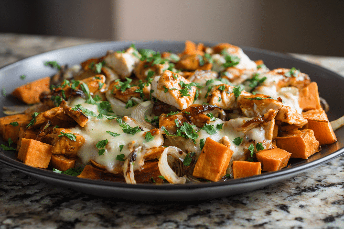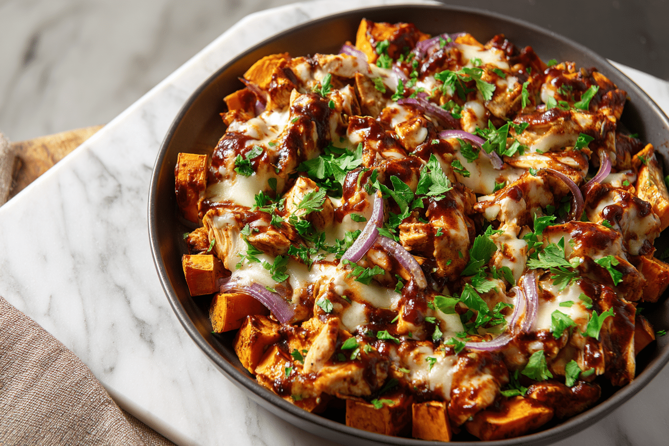 With golden sweet potatoes, juicy BBQ chicken, and gooey cheese, this dish delivers bold flavor and a satisfying texture in every bite.