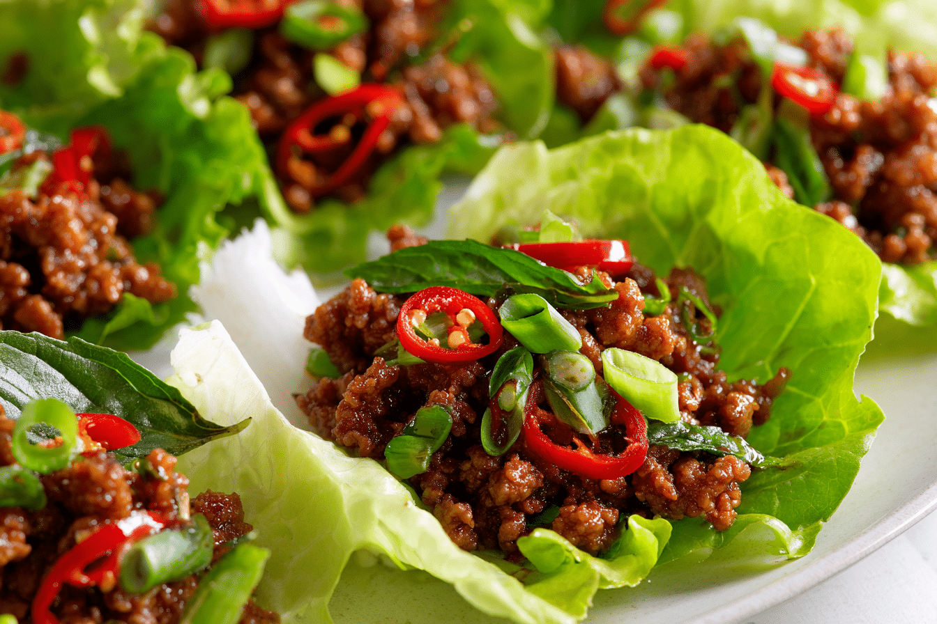 Butter lettuce or romaine leaves act as the crisp vessel. Butter lettuce is tender and pliable, while romaine offers extra crunch. Both hold the warm beef filling well and add a refreshing contrast.