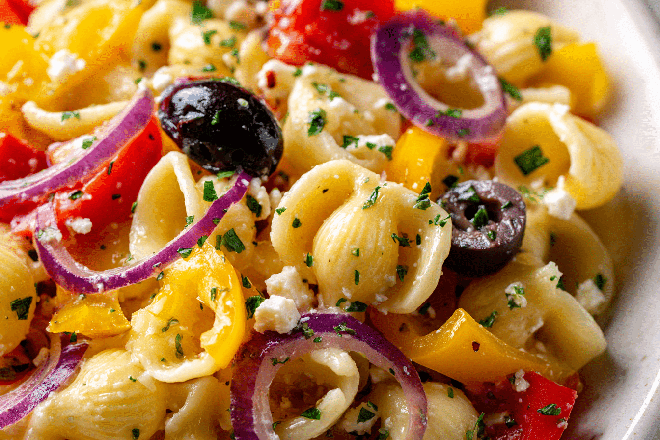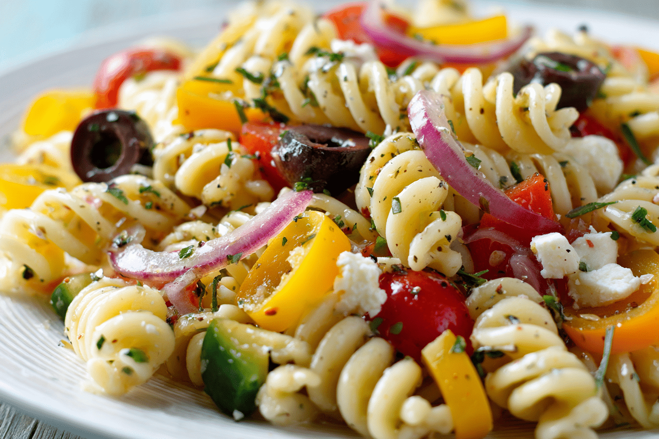 A fresh and colorful pasta salad tossed in Italian dressing with crisp vegetables and mozzarella, perfect for gatherings and everyday meals.
