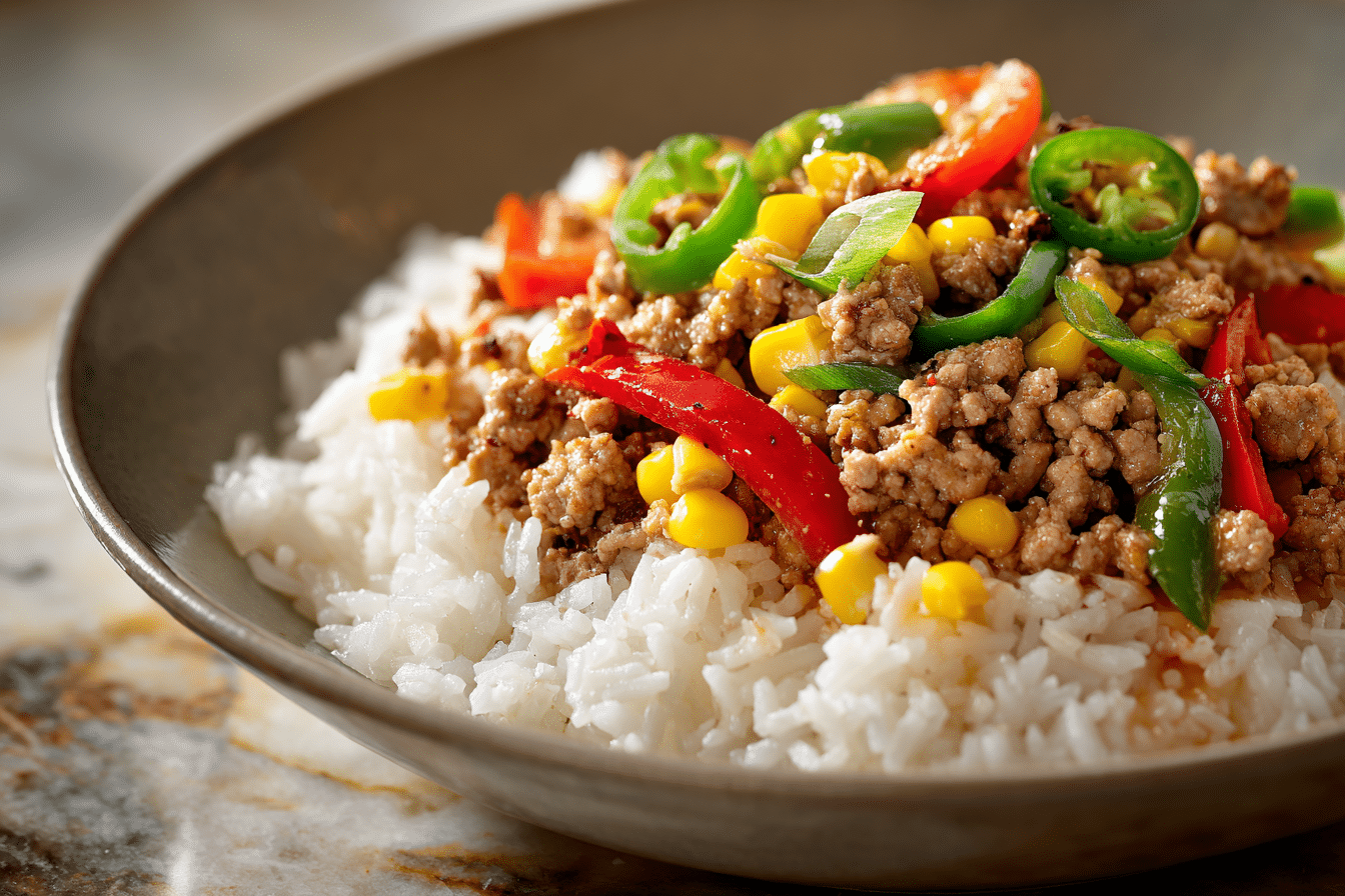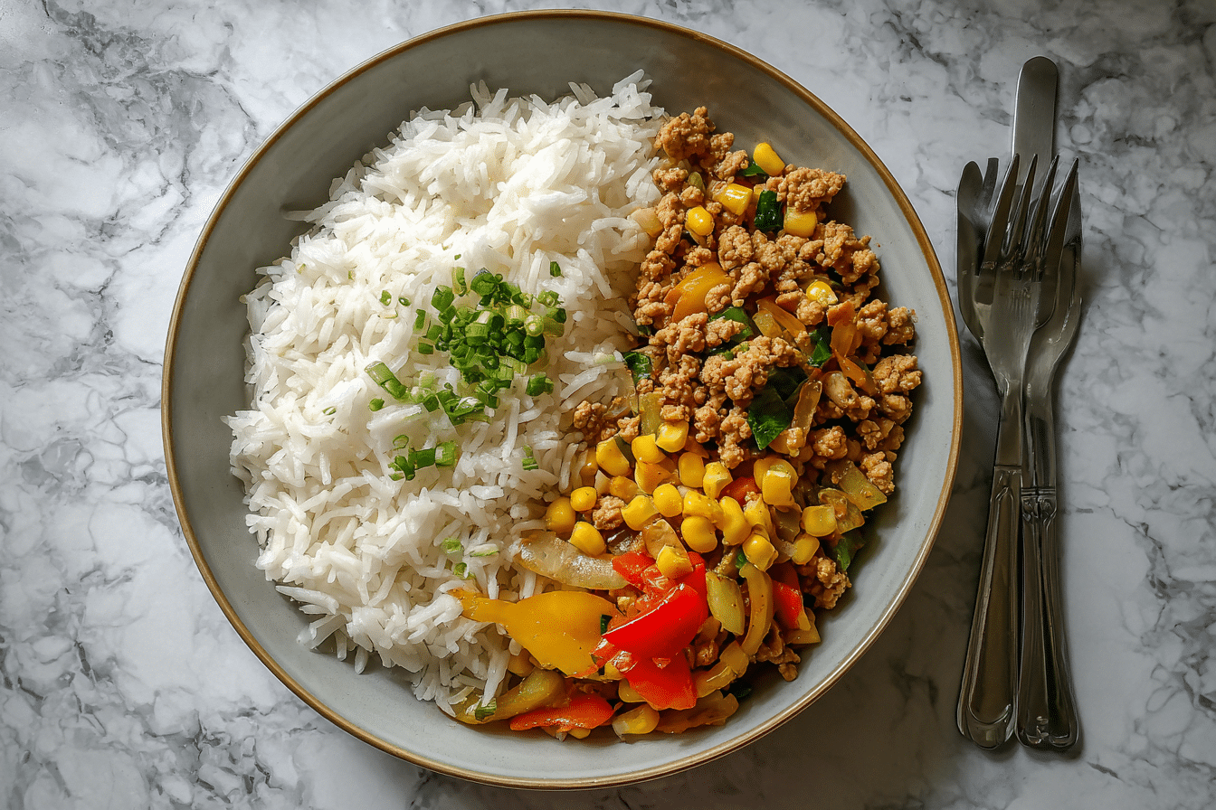 Rice forms the base of the meal. White rice is commonly used because it is soft and neutral in flavor, allowing the turkey mixture to stand out. Brown rice can also be used for a firmer texture and slightly nutty taste. The rice helps absorb juices from the turkey, keeping the dish cohesive.