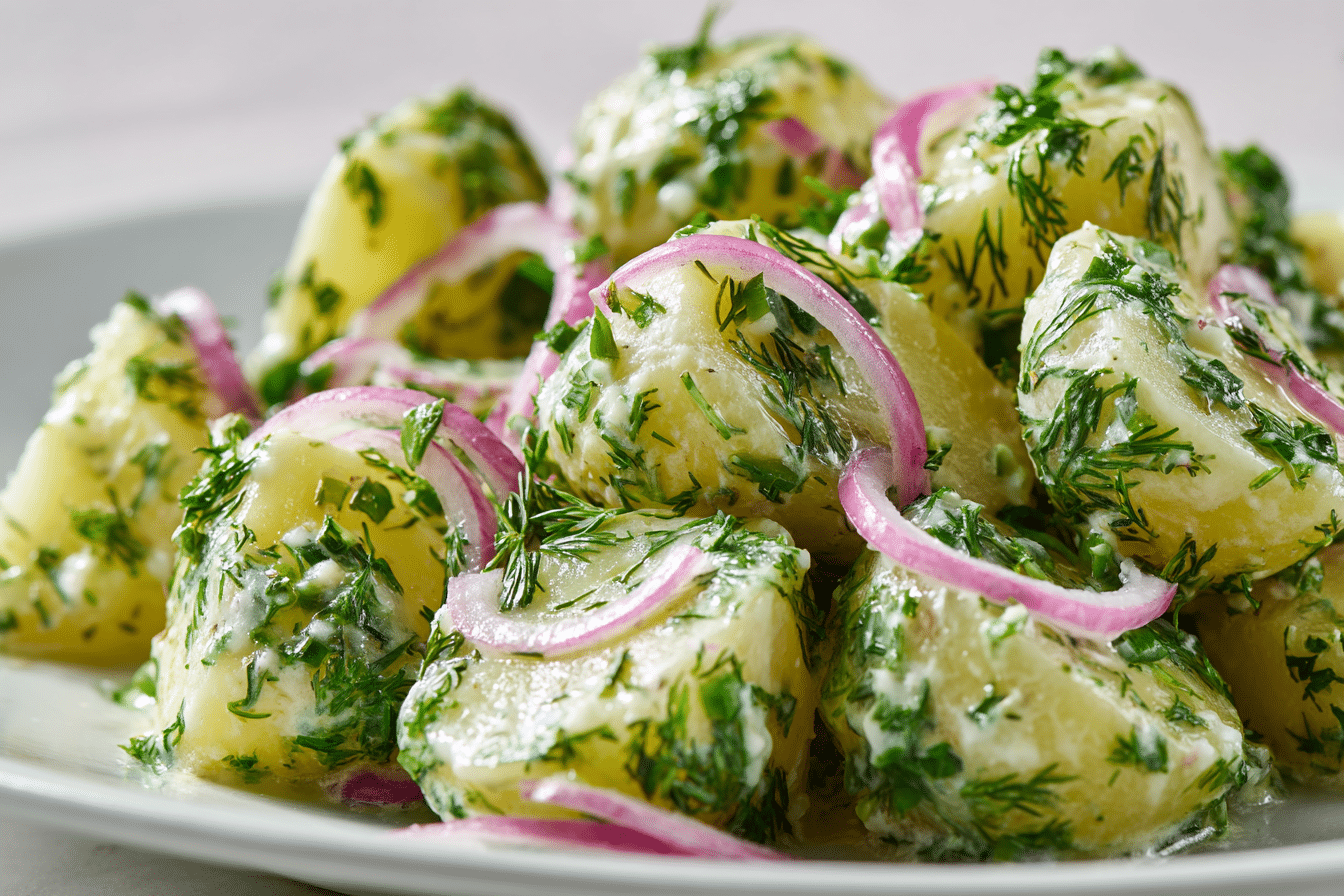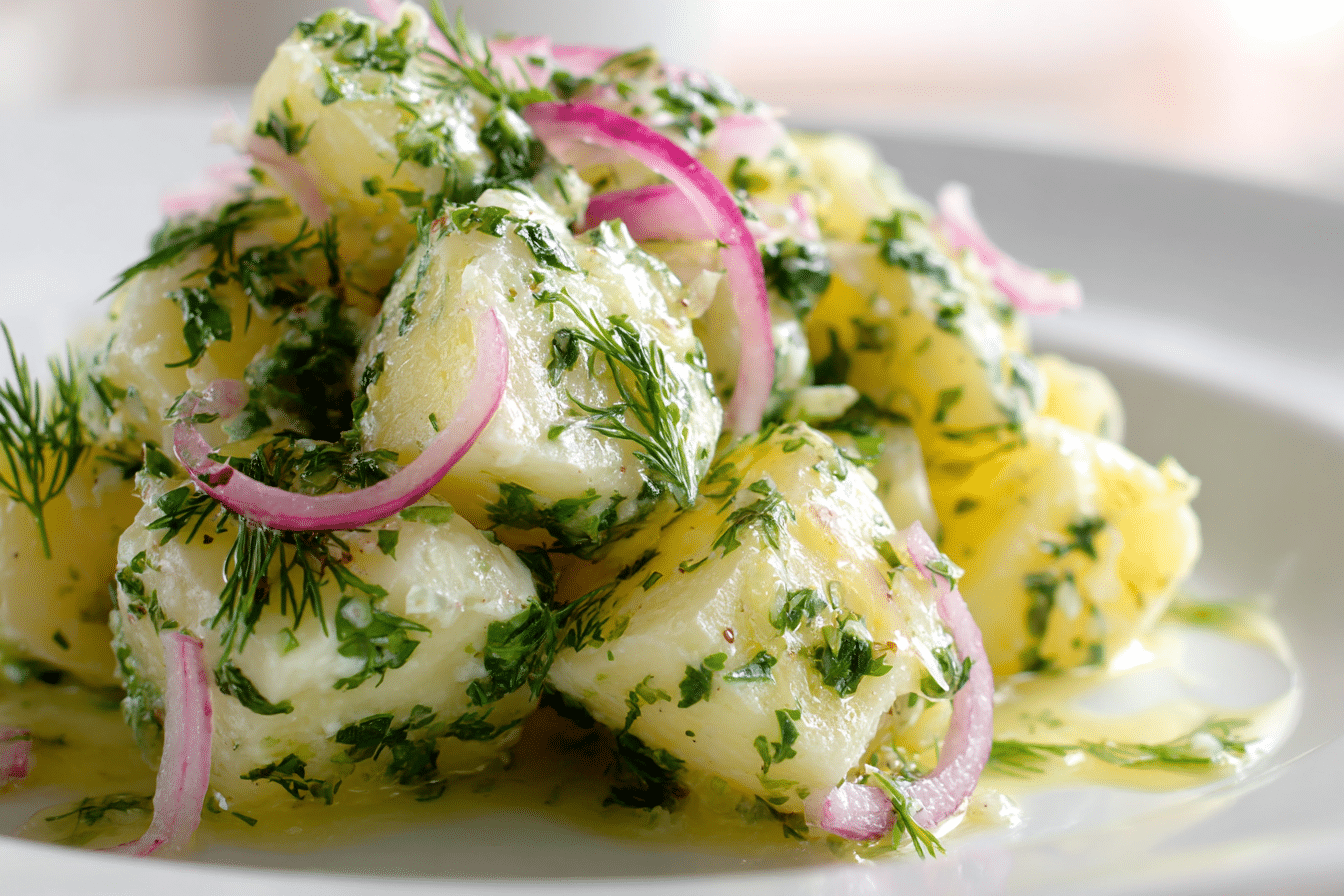 Potatoes are the base of this dish, and waxy varieties such as Yukon Gold or red potatoes work best. They maintain their shape after boiling and offer a naturally smooth texture that pairs well with the light dressing.