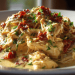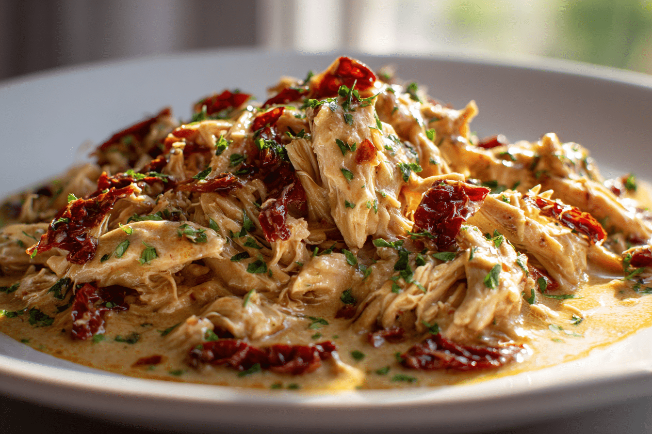 The slow cooker allows the chicken to become incredibly tender while the ingredients blend together into a smooth, flavorful sauce. Each bite combines creamy richness with subtle garlic flavor and the mild tang of sun-dried tomatoes.