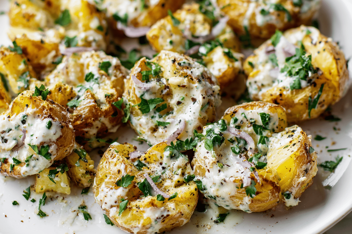 A crispy and creamy vegan potato salad made with smashed roasted potatoes and a tangy plant-based dressing.
