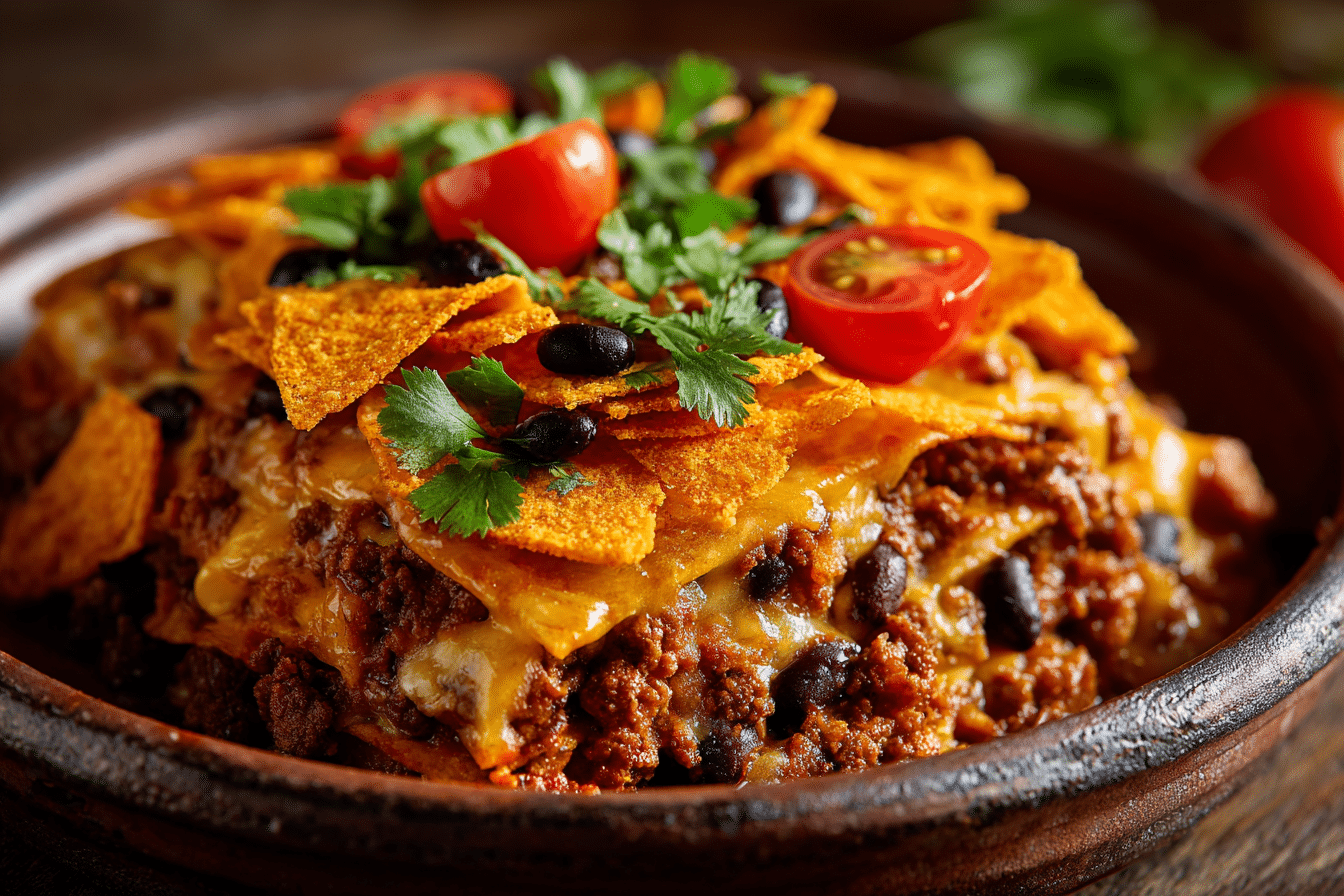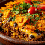 A crowd-pleasing layered casserole featuring seasoned ground beef, refried beans, corn, sour cream, melted cheddar, and crushed Doritos. Baked to golden perfection for a fun and comforting Tex-Mex dinner.
