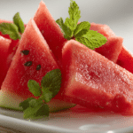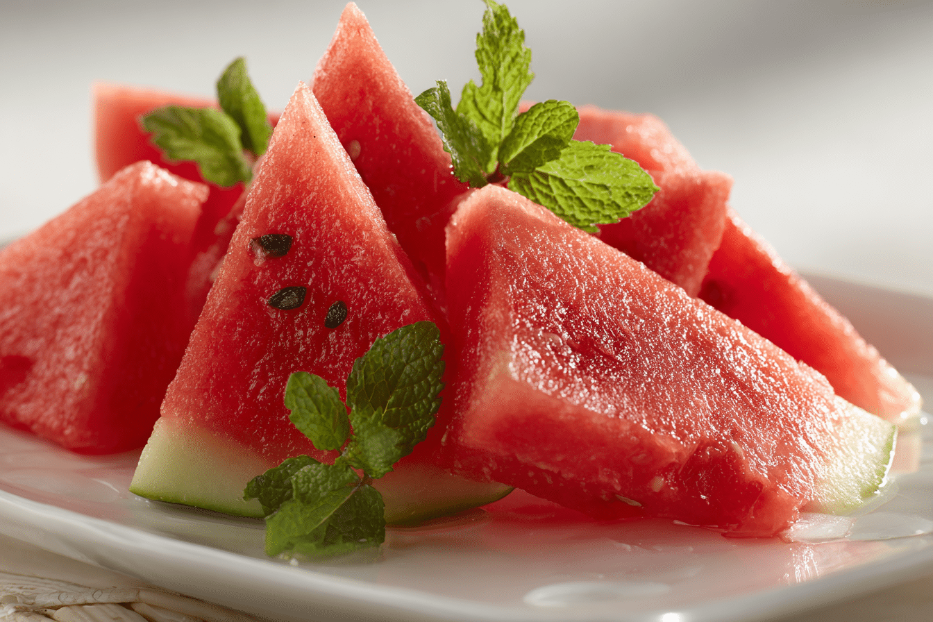 Mint leaves sometimes accompany watermelon slices as garnish. Their cool herbal aroma pairs naturally with the fruit and adds visual appeal to serving platters.