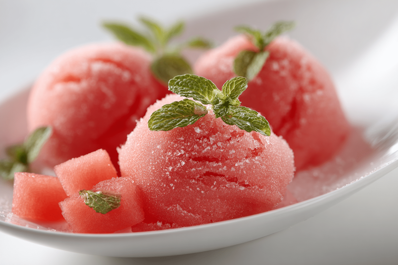 Fresh mint occasionally appears as an optional accent. A few leaves blended with the fruit create a gentle herbal note that complements watermelon beautifully. For a pure fruit experience, the sorbet works perfectly without additional herbs.